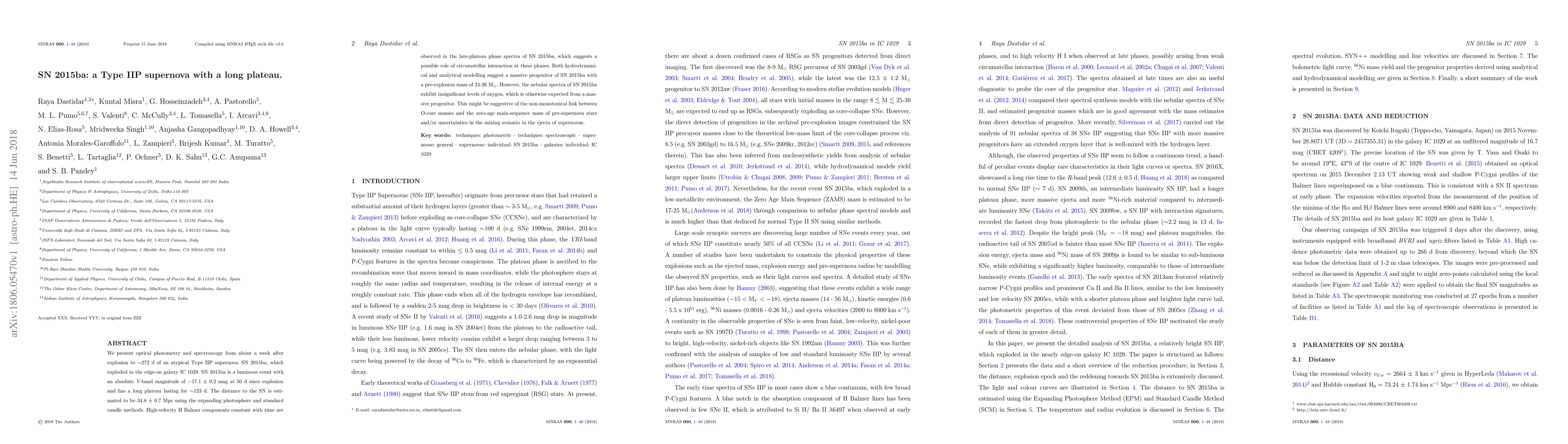 A newly discovered supernova, SN 2015ba, has a long plateau phase lasting 123 days, with high-velocity H-Balmer components suggesting circumstellar interaction. The massive progenitor's oxygen levels in the nebular spectra hint at uncertainties in mixing scenarios.