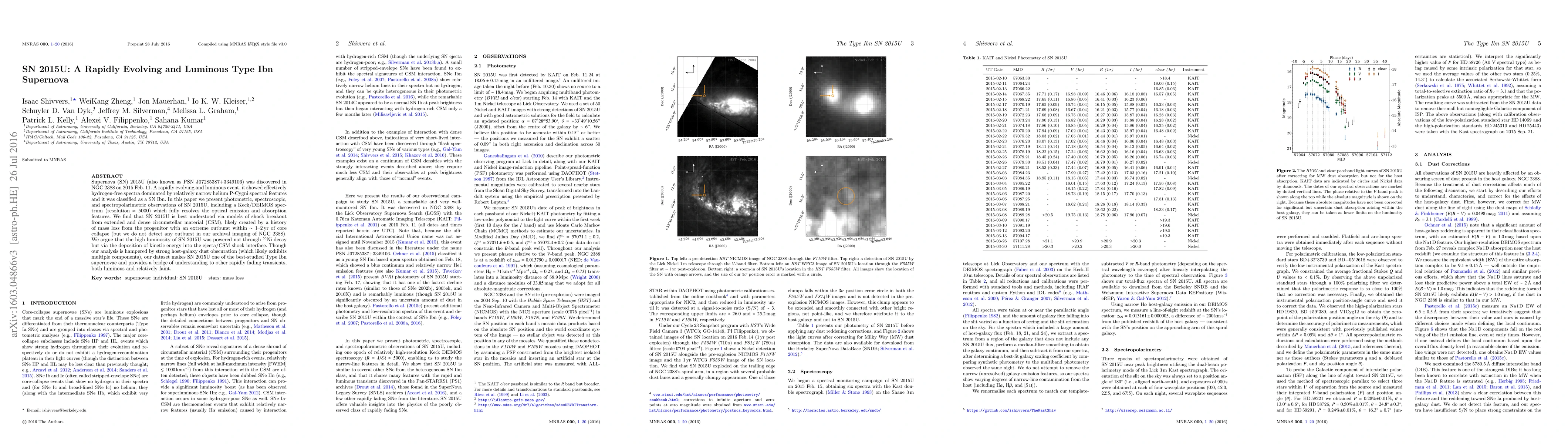 SN 2015U, a rapidly evolving and luminous Type Ibn supernova, was discovered in NGC 2388 and characterized by hydrogen-free spectra with prominent helium features. The high luminosity is attributed to shock breakout from dense circumstellar material, rather than nickel decay, providing insights into the progenitor's mass loss history and the nature of similar transient events.