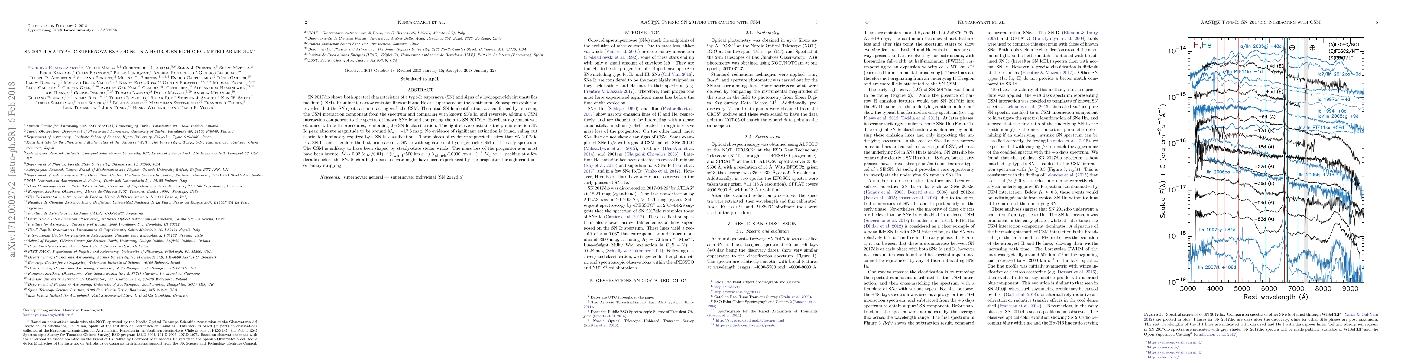 SN 2017dio is identified as a type-Ic supernova with early spectral features indicative of a hydrogen-rich circumstellar medium, challenging conventional classifications. The interaction between the supernova ejecta and the circumstellar material confirms its type-Ic nature, suggesting intense progenitor star mass loss prior to the explosion.