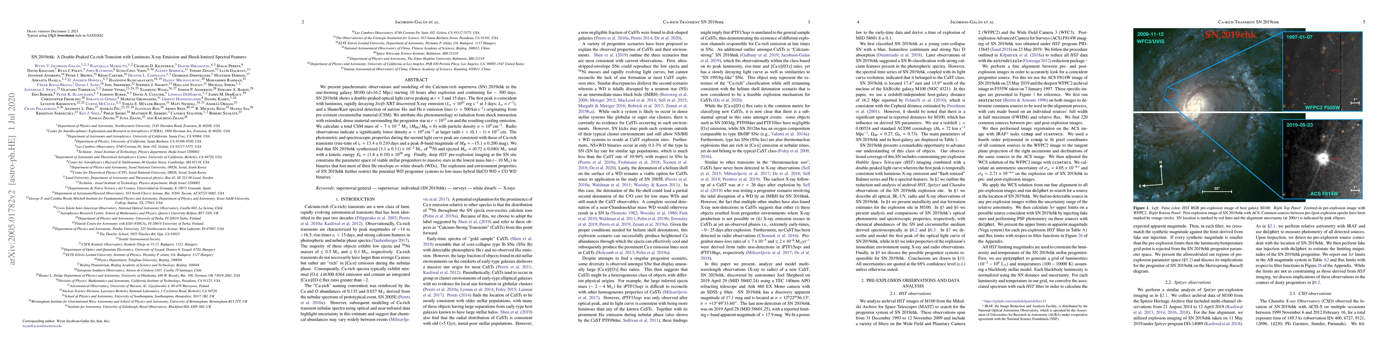 SN 2019ehk is a double-peaked, Ca-rich supernova in M100, characterized by luminous X-ray emission and shock-ionized spectral features. The first peak correlates with high-energy X-ray emission and narrow emission lines from circumstellar material, suggesting interaction with dense, extended material.