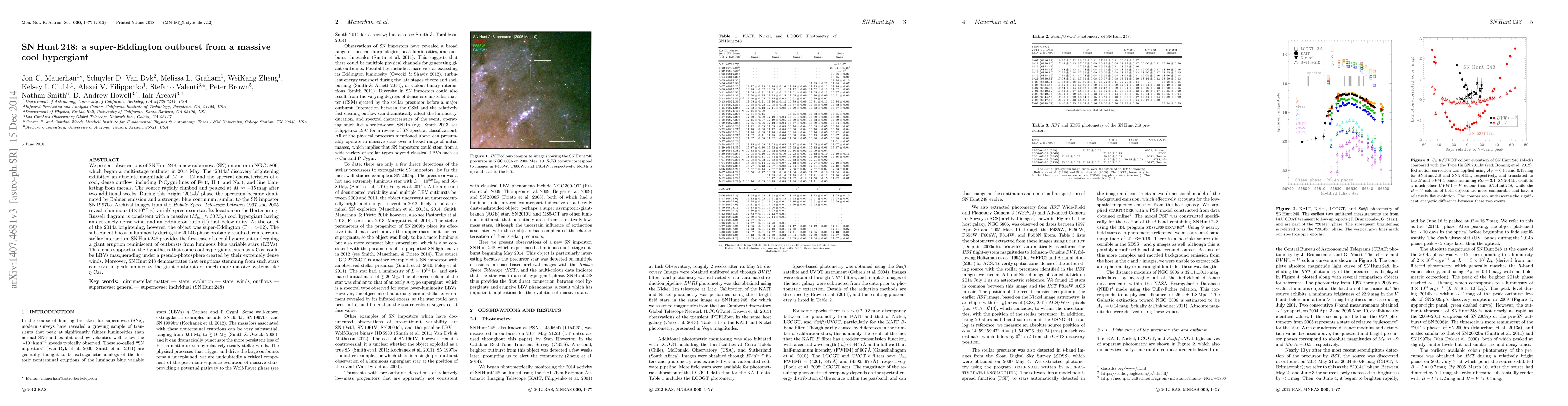 We present photometric and spectroscopic observations of SN Hunt 248, a new supernova (SN) impostor in NGC 5806, which began a multi-stage outburst in 2014 May. The initial '2014a' discovery brightening exhibited an absolute magnitude of M~-12 and the spectral characteristics of a cool dense outflow, including P-Cygni lines of Fe II, H I, Na I, and strong line blanketing from metals. The source rapidly climbed and peaked near M~-15 mag after two additional weeks. During this bright '2014b' phase the spectrum became dominated by Balmer emission and a stronger blue continuum, similar to the SN impostor SN 1997bs. Archival images from the Hubble Space Telescope between 1997 and 2005 reveal a luminous (4e5 Lsun) variable precursor star. Its location on the Hertzsprung-Russell diagram is consistent with a massive (M_init~30 Msun) cool hypergiant having an extremely dense wind and an Eddington ratio just below unity. At the onset of the recent 2014a brightening, however, the object became super-Eddington. The subsequent boost in luminosity during the 2014b phase probably resulted from circumstellar interaction. SN Hunt 248 provides the first case of a cool hypergiant undergoing a giant eruption reminiscent of outbursts from luminous blue variable (LBV) stars. This lends support to the hypothesis that some cool hypergiants, such as Rho Cas, could be LBVs masquerading under a pseudo-photosphere created by their extremely dense winds. Moreover, SN Hunt 248 demonstrates that eruptions stemming from such stars can rival in peak luminosity the giant outbursts of much more massive systems like Eta Car.