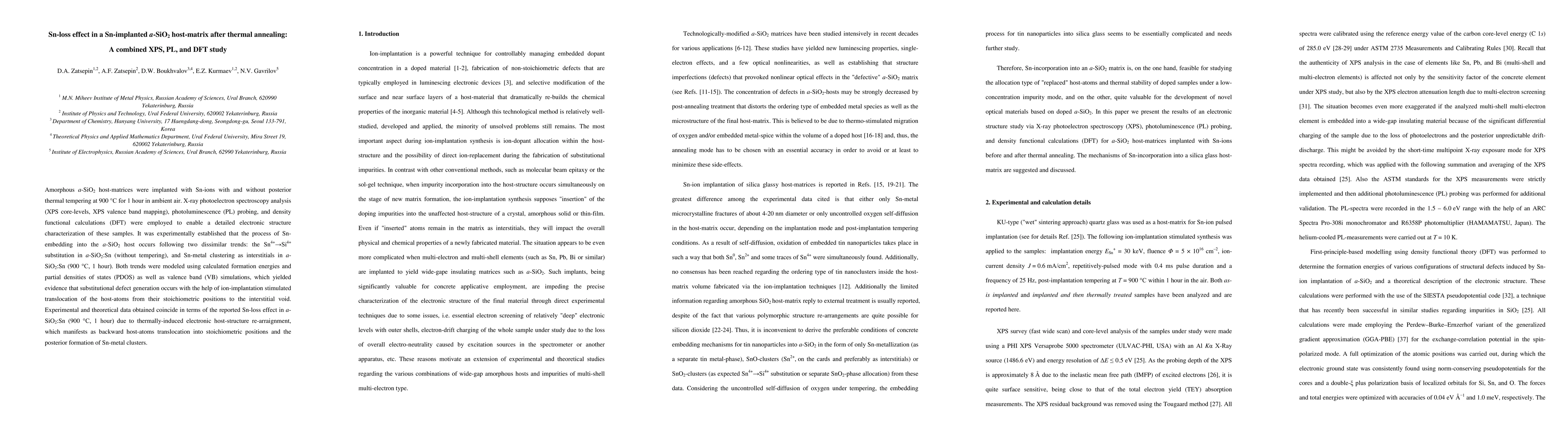 Amorphous a-SiO2 host-matrices were implanted with Sn-ions with and without posterior thermal tempering at 900 {\deg}C for 1 hour in ambient air. X-ray photoelectron spectroscopy analysis (XPS core-levels, XPS valence band mapping), photoluminescence (PL) probing, and density functional calculations (DFT) were employed to enable a detailed electronic structure characterization of these samples. It was experimentally established that the process of Sn-embedding into the a-SiO2 host occurs following two dissimilar trends: the Sn4+ -> Si4+ substitution in a-SiO2:Sn (without tempering), and Sn-metal clustering as interstitials in a-SiO2:Sn (900 {\deg}C, 1 hour). Both trends were modeled using calculated formation energies and partial densities of states (PDOS) as well as valence band (VB) simulations, which yielded evidence that substitutional defect generation occurs with the help of ion-implantation stimulated translocation of the host-atoms from their stoichiometric positions to the interstitial void. Experimental and theoretical data obtained coincide in terms of the reported Sn-loss effect in a-SiO2:Sn (900 {\deg}C, 1 hour) due to thermally-induced electronic host-structure re-arraignment, which manifests as backward host-atoms translocation into stoichiometric positions and the posterior formation of Sn-metal clusters.