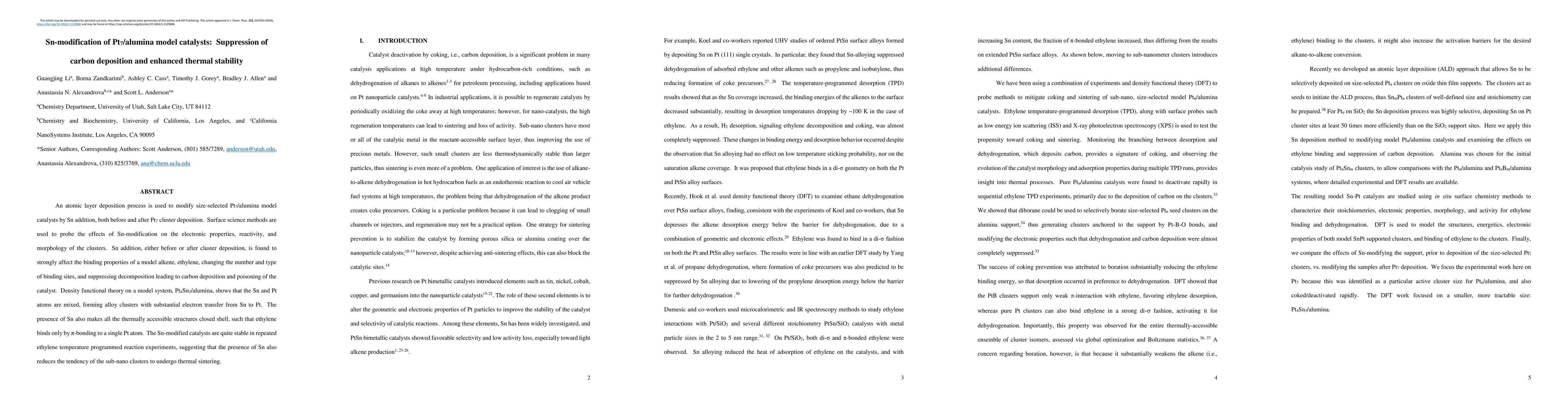 An atomic layer deposition process is used to modify size-selected Pt7/alumina model catalysts by Sn addition, both before and after Pt7 cluster deposition. Surface science methods are used to probe the effects of Sn-modification on the electronic properties, reactivity, and morphology of the clusters. Sn addition, either before or after cluster deposition, is found to strongly affect the binding properties of a model alkene, ethylene, changing the number and type of binding sites, and suppressing decomposition leading to carbon deposition and poisoning of the catalyst. Density functional theory on a model system, Pt4Sn3/alumina, shows that the Sn and Pt atoms are mixed, forming alloy clusters with substantial electron transfer from Sn to Pt. The presence of Sn also makes all the thermally accessible structures closed shell, such that ethylene binds only by {\pi}-bonding to a single Pt atom. The Sn-modified catalysts are quite stable in repeated ethylene temperature programmed reaction experiments, suggesting that the presence of Sn also reduces the tendency of the sub-nano-clusters to undergo thermal sintering.