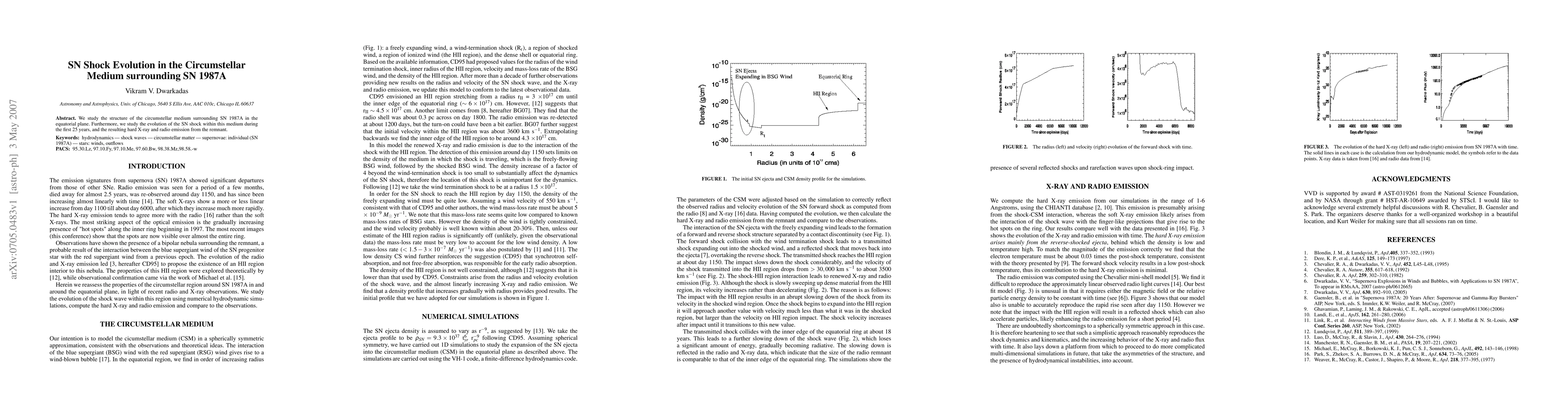 We study the structure of the circumstellar medium surrounding SN 1987A in the equatorial plane. Furthermore, we study the evolution of the SN shock within this medium during the first 25 years, and the resulting hard X-ray and radio emission from the remnant.