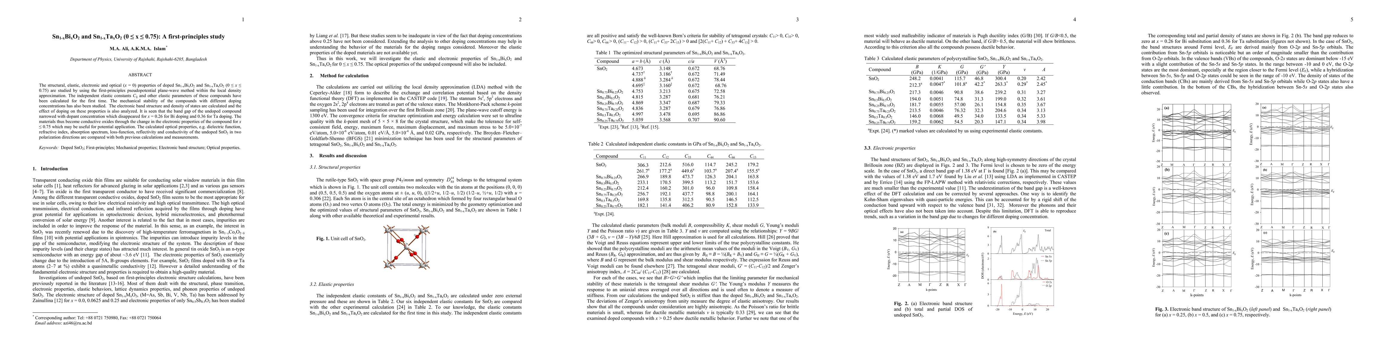 The structural, elastic, electronic and optical (x = 0) properties of doped Sn1-xBixO2 and Sn1-xTaxO2 (0 \leq x \leq 0.75) are studied by using the first-principles pseudopotential plane-wave method within the local density approximation. The independent elastic constants Cij and other elastic parameters of these compounds have been calculated for the first time. The mechanical stability of the compounds with different doping concentrations has also been studied. The electronic band structure and density of states are calculated and the effect of doping on these properties is also analyzed. It is seen that the band gap of the undoped compound narrowed with dopant concentration which disappeared for x = 0.26 for Bi doping and 0.36 for Ta doping. The materials thus become conductive oxides through the change in the electronic properties of the compound for x \leq 0.75 which may be useful for potential application. The calculated optical properties, e.g. dielectric function, refractive index, absorption spectrum, loss-function, reflectivity and conductivity of the undoped SnO2 in two polarization directions are compared with both previous calculations and measurements. Keywords: Doped SnO2; First-principles; Mechanical properties; Electronic band structure; Optical properties.