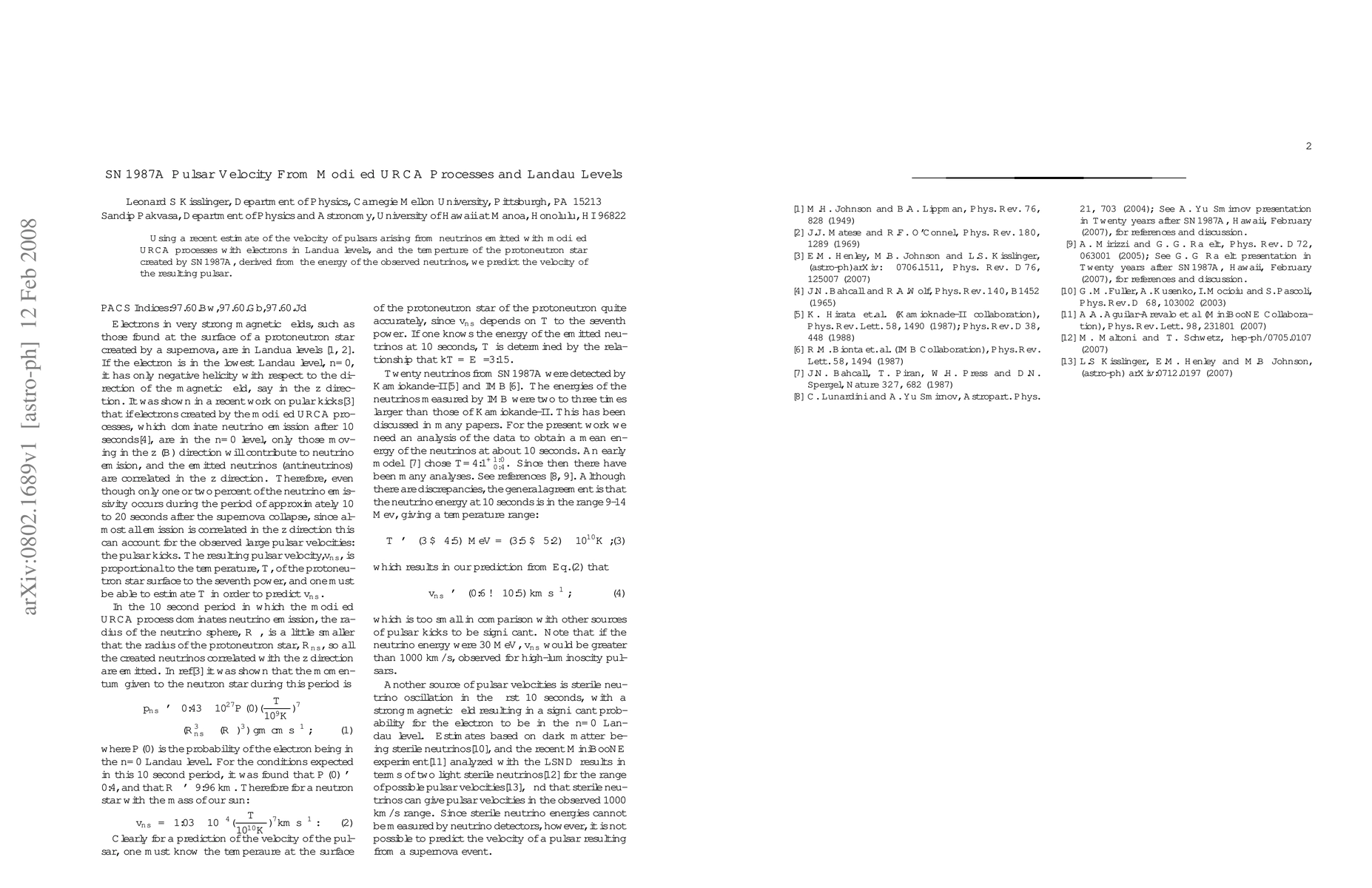 Using a recent estimate of the velocity of pulsars arising from neutrinos emitted with modified URCA processes with electrons in Landua levels, and the temperture of the protoneutron star created by SN1987A, derived from the energy of the observed neutrinos, we predict the velocity of the resulting pulsar.