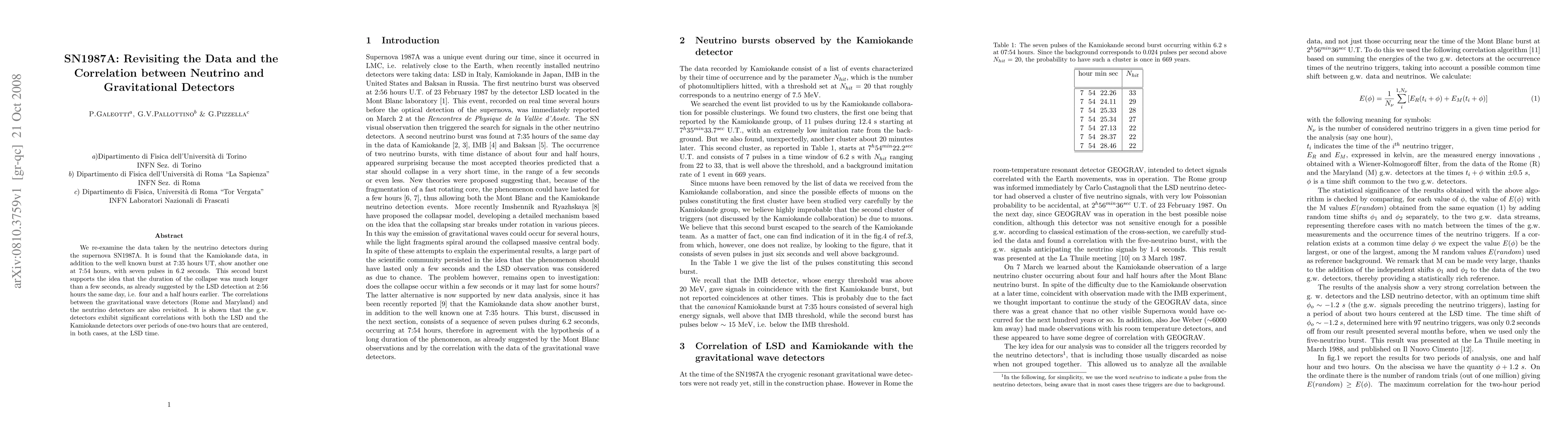 The paper re-analyzes SN1987A neutrino detector data, identifying a second burst at 7:54 hours UT with seven pulses in 6.2 seconds, supporting a longer collapse duration. It also revisits correlations between gravitational wave detectors and neutrino detectors, finding significant correlations centered around the LSD detection time.