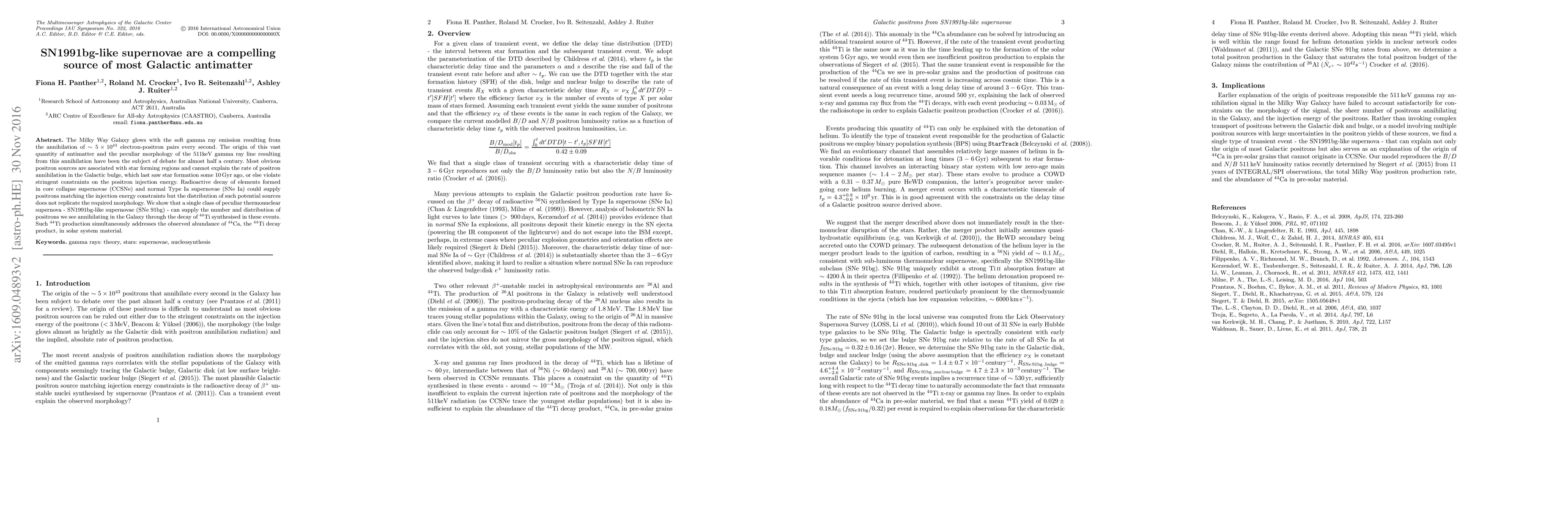 The Milky Way Galaxy glows with the soft gamma ray emission resulting from the annihilation of $\sim 5 \times 10^{43}$ electron-positron pairs every second. The origin of this vast quantity of antimatter and the peculiar morphology of the 511keV gamma ray line resulting from this annihilation have been the subject of debate for almost half a century. Most obvious positron sources are associated with star forming regions and cannot explain the rate of positron annihilation in the Galactic bulge, which last saw star formation some $10\,\mathrm{Gyr}$ ago, or else violate stringent constraints on the positron injection energy. Radioactive decay of elements formed in core collapse supernovae (CCSNe) and normal Type Ia supernovae (SNe Ia) could supply positrons matching the injection energy constraints but the distribution of such potential sources does not replicate the required morphology. We show that a single class of peculiar thermonuclear supernova - SN1991bg-like supernovae (SNe 91bg) - can supply the number and distribution of positrons we see annihilating in the Galaxy through the decay of $^{44}$Ti synthesised in these events. Such $^{44}$Ti production simultaneously addresses the observed abundance of $^{44}$Ca, the $^{44}$Ti decay product, in solar system material.