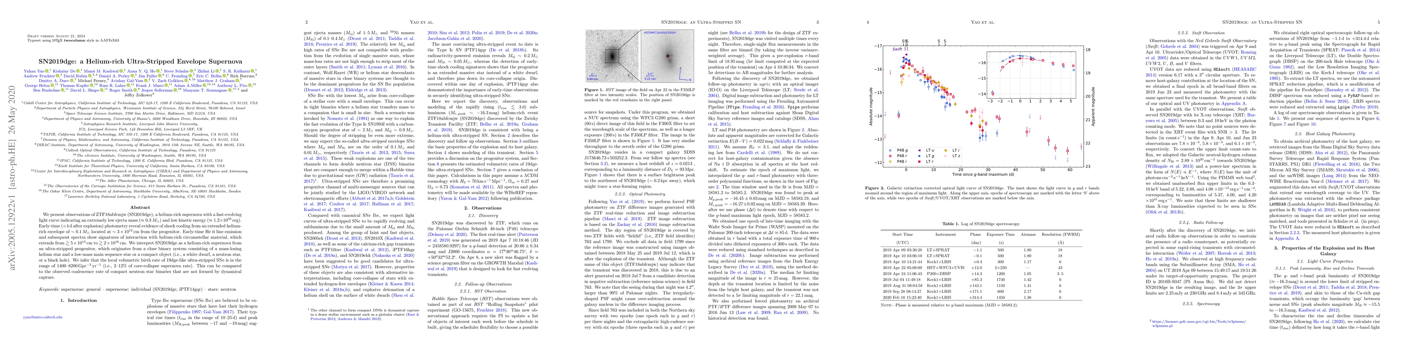 SN2019dge is a helium-rich, ultra-stripped envelope supernova with a low ejecta mass and kinetic energy, suggesting it originated from a close binary system. The local volumetric birth rate of such ultra-stripped supernovae is estimated to be 2-12% of the core-collapse supernova rate.