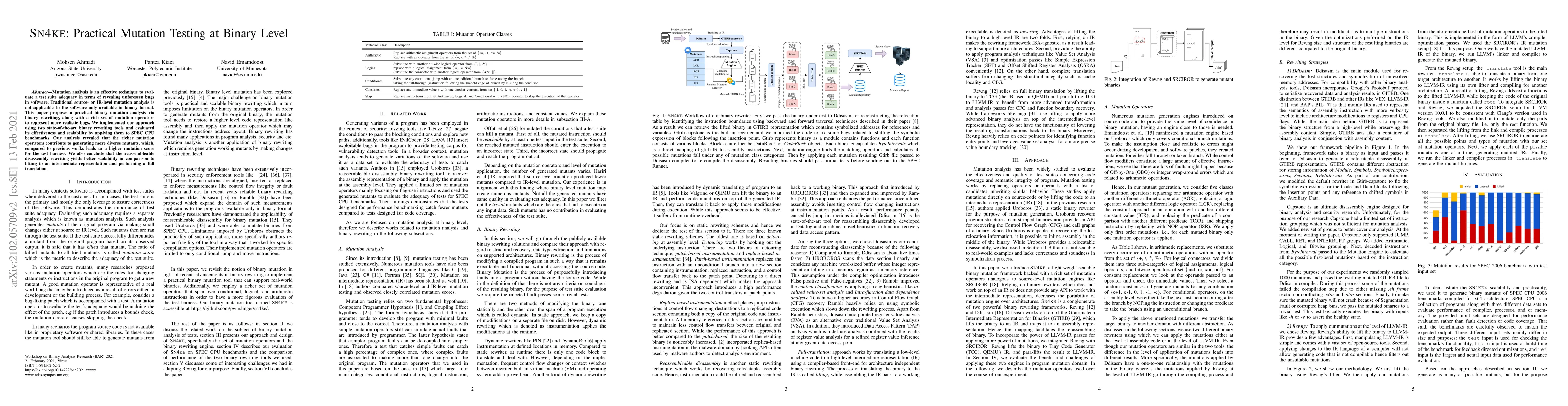 This paper introduces SN4KE, a practical binary-level mutation testing framework using binary rewriting and advanced mutation operators to evaluate test suite adequacy for software available only in binary format. The study demonstrates higher mutation scores and better scalability through reassembleable disassembly rewriting compared to traditional IR-based methods.