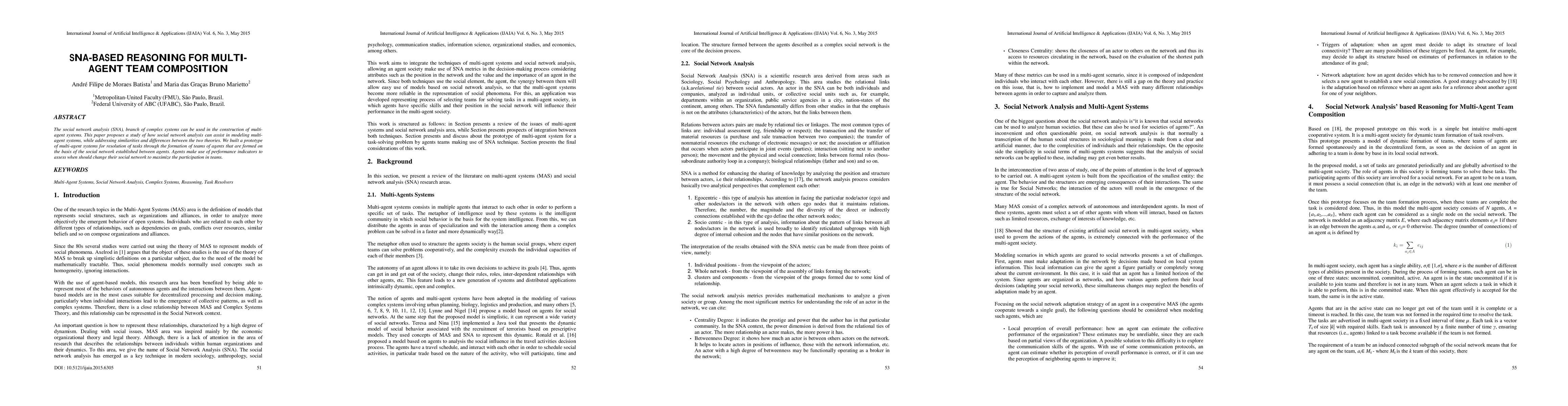 The social network analysis (SNA), branch of complex systems can be used in the construction of multiagent systems. This paper proposes a study of how social network analysis can assist in modeling multiagent systems, while addressing similarities and differences between the two theories. We built a prototype of multi-agent systems for resolution of tasks through the formation of teams of agents that are formed on the basis of the social network established between agents. Agents make use of performance indicators to assess when should change their social network to maximize the participation in teams