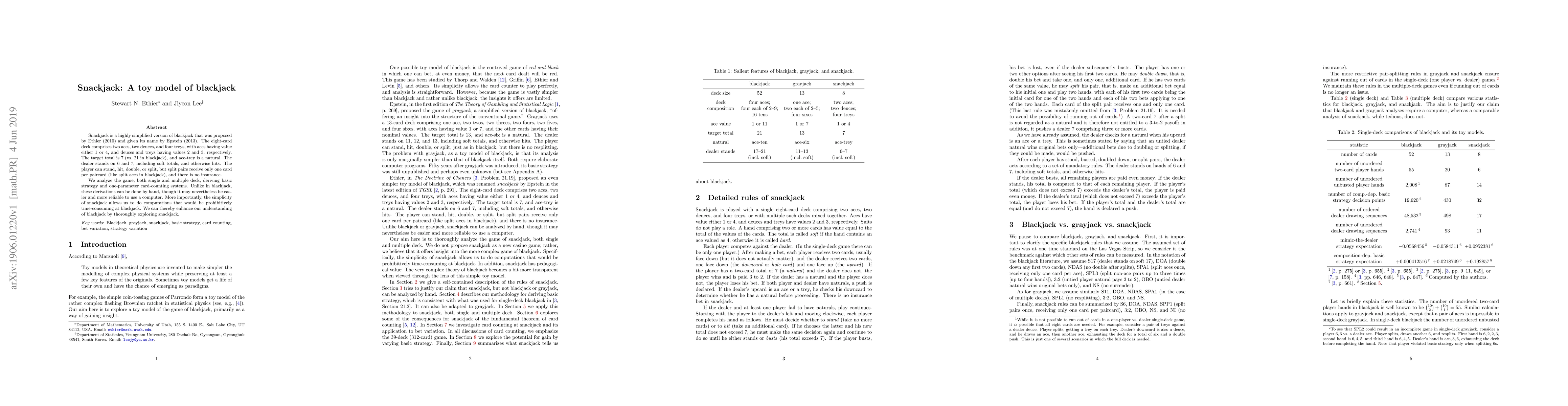 Snackjack is a highly simplified version of blackjack that was proposed by Ethier (2010) and given its name by Epstein (2013). The eight-card deck comprises two aces, two deuces, and four treys, with aces having value either 1 or 4, and deuces and treys having values 2 and 3, respectively. The target total is 7 (vs. 21 in blackjack), and ace-trey is a natural. The dealer stands on 6 and 7, including soft totals, and otherwise hits. The player can stand, hit, double, or split, but split pairs receive only one card per paircard (like split aces in blackjack), and there is no insurance. We analyze the game, both single and multiple deck, deriving basic strategy and one-parameter card-counting systems. Unlike in blackjack, these derivations can be done by hand, though it may nevertheless be easier and more reliable to use a computer. More importantly, the simplicity of snackjack allows us to do computations that would be prohibitively time-consuming at blackjack. We can thereby enhance our understanding of blackjack by thoroughly exploring snackjack.