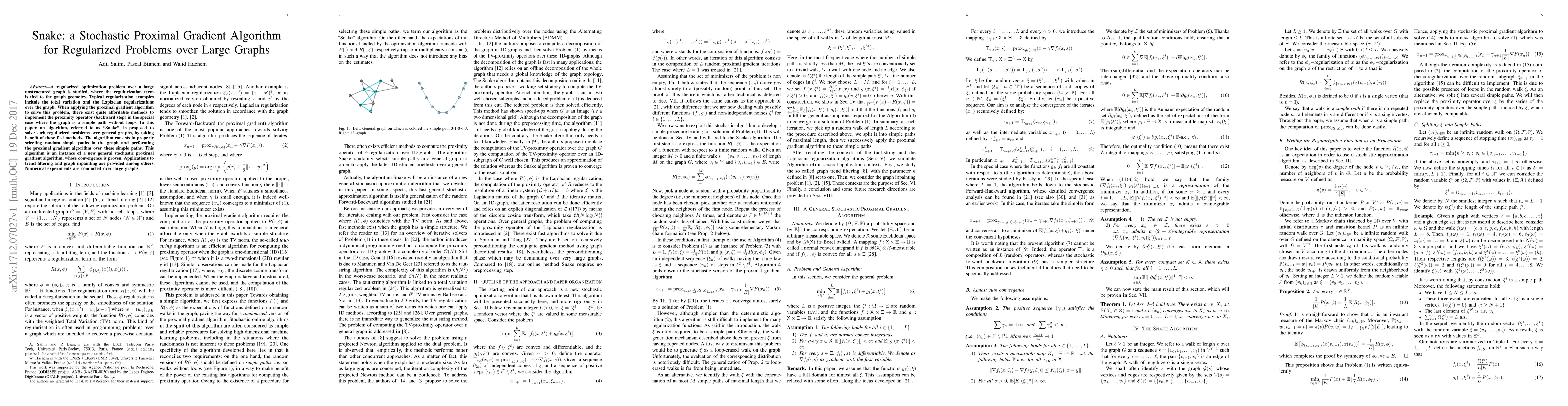 The paper proposes "Snake," a stochastic proximal gradient algorithm for solving regularized optimization problems over large, unstructured graphs. The algorithm selects random simple paths to efficiently implement the proximal gradient method, proving its convergence and demonstrating applications in trend filtering and graph inpainting through numerical experiments.