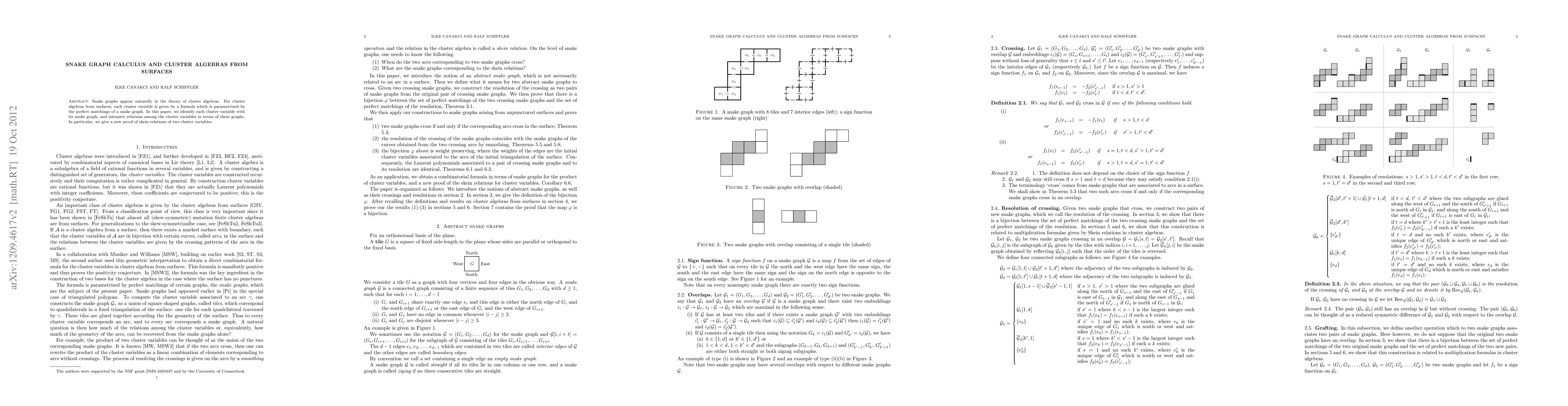 This paper explores the connection between snake graphs and cluster algebras derived from surfaces, showing how each cluster variable corresponds to a snake graph and providing a new proof for the skein relations among these variables through graph interpretations.