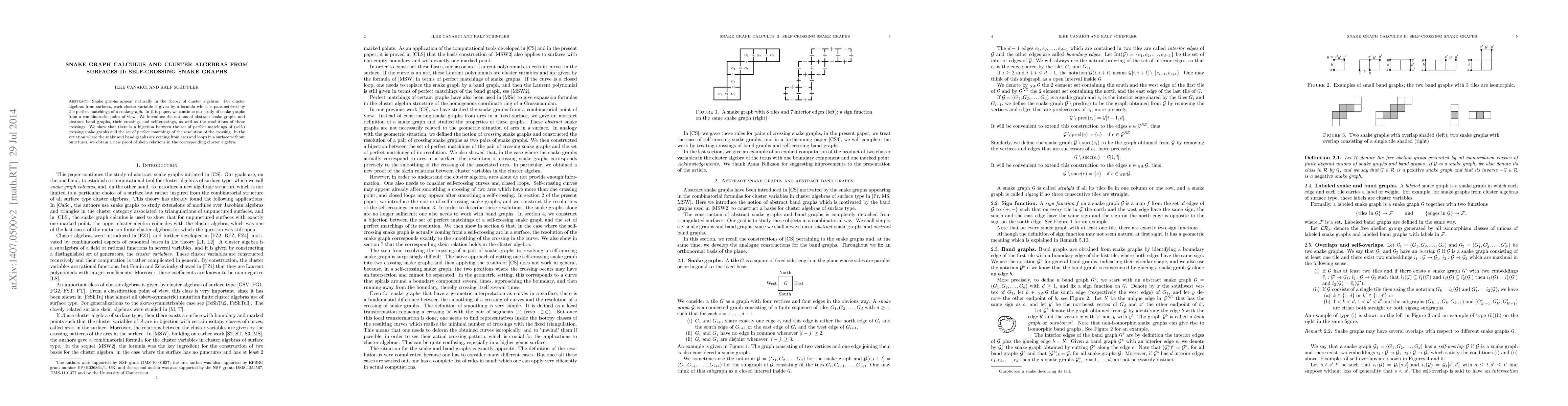 This paper explores the combinatorial aspects of snake graphs, introducing abstract snake and band graphs, their crossings, and resolutions. It establishes a bijection between perfect matchings of self-crossing snake graphs and those of their resolutions, providing a new proof of skein relations in cluster algebras derived from surfaces.