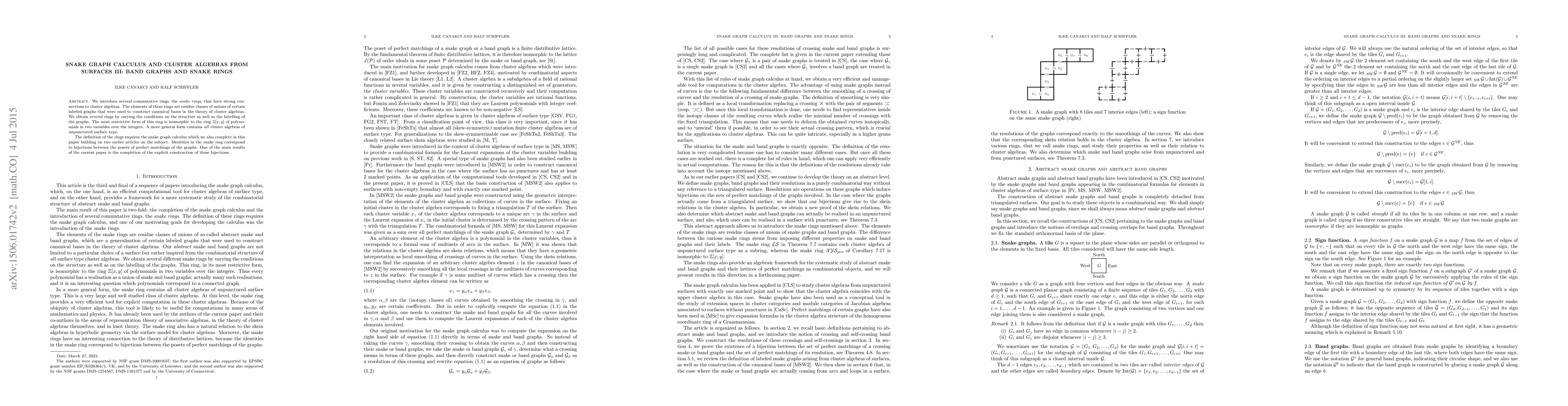 We introduce several commutative rings, the snake rings, that have strong connections to cluster algebras. The elements of these rings are residue classes of unions of certain labeled graphs that were used to construct canonical bases in the theory of cluster algebras. We obtain several rings by varying the conditions on the structure as well as the labelling of the graphs. The most restrictive form of this ring is isomorphic to the ring $\mathbb{Z}[x,y]$ of polynomials in two variables over the integers. A more general form contains all cluster algebras of unpunctured surface type. The definition of the rings requires the snake graph calculus which is completed in this paper building on two earlier articles on the subject. Identities in the snake ring correspond to bijections between the posets of perfect matchings of the graphs. One of the main results of the current paper is the completion of the explicit construction of these bijections.