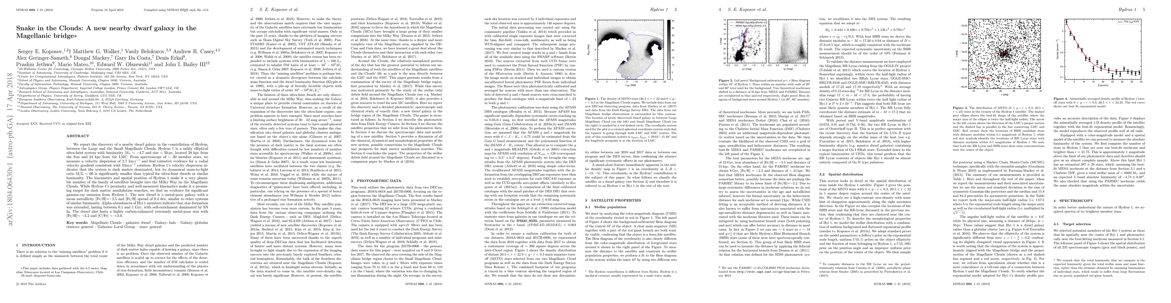 We report the discovery of a nearby dwarf galaxy in the constellation of Hydrus, between the Large and the Small Magellanic Clouds. Hydrus 1 is a mildy elliptical ultra-faint system with luminosity $M_V\sim$ -4.7 and size $\sim$ 50 pc, located 28 kpc from the Sun and 24 kpc from the LMC. From spectroscopy of $\sim$ 30 member stars, we measure a velocity dispersion of 2.7 km/s and find tentative evidence for a radial velocity gradient consistent with 3 km/s rotation. Hydrus 1's velocity dispersion indicates that the system is dark matter dominated, but its dynamical mass-to-light ratio M/L $\sim$ 66 is significantly smaller than typical for ultra-faint dwarfs at similar luminosity. The kinematics and spatial position of Hydrus~1 make it a very plausible member of the family of satellites brought into the Milky Way by the Magellanic Clouds. While Hydrus 1's proximity and well-measured kinematics make it a promising target for dark matter annihilation searches, we find no evidence for significant gamma-ray emission from Hydrus 1. The new dwarf is a metal-poor galaxy with a mean metallicity [Fe/H]=-2.5 and [Fe/H] spread of 0.4 dex, similar to other systems of similar luminosity. Alpha-abundances of Hyi 1 members indicate that star-formation was extended, lasting between 0.1 and 1 Gyr, with self-enrichment dominated by SN Ia. The dwarf also hosts a highly carbon-enhanced extremely metal-poor star with [Fe/H] $\sim$ -3.2 and [C/Fe] $\sim$ +3.0.