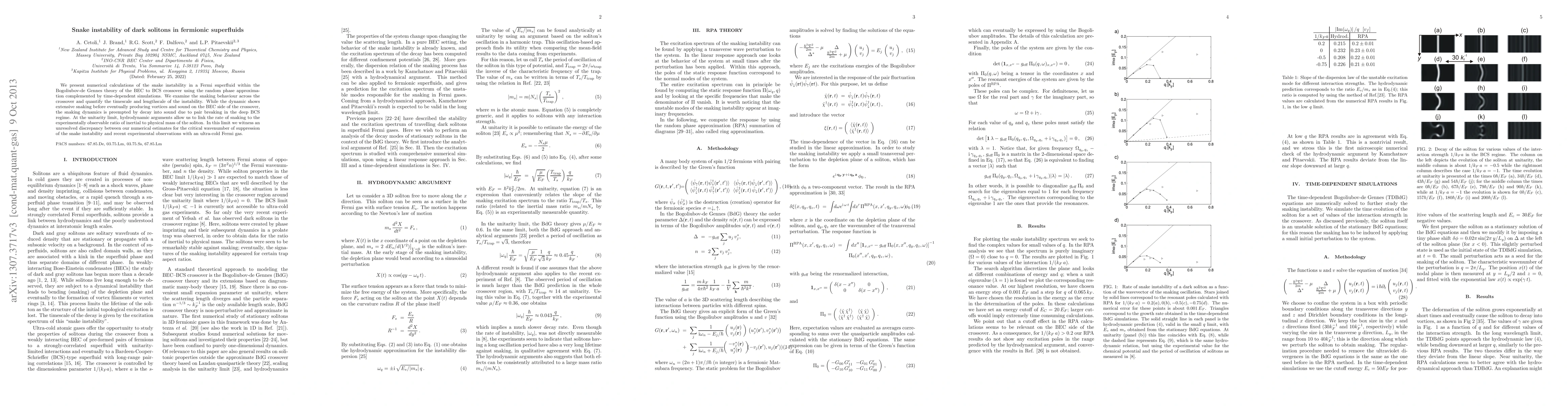 We present numerical calculations of the snake instability in a Fermi superfluid within the Bogoliubov-de Gennes theory of the BEC to BCS crossover using the random phase approximation complemented by time-dependent simulations. We examine the snaking behaviour across the crossover and quantify the timescale and lengthscale of the instability. While the dynamic shows extensive snaking before eventually producing vortices and sound on the BEC side of the crossover, the snaking dynamics is preempted by decay into sound due to pair breaking in the deep BCS regime. At the unitarity limit, hydrodynamic arguments allow us to link the rate of snaking to the experimentally observable ratio of inertial to physical mass of the soliton. In this limit we witness an unresolved discrepancy between our numerical estimates for the critical wavenumber of suppression of the snake instability and recent experimental observations with an ultra-cold Fermi gas.