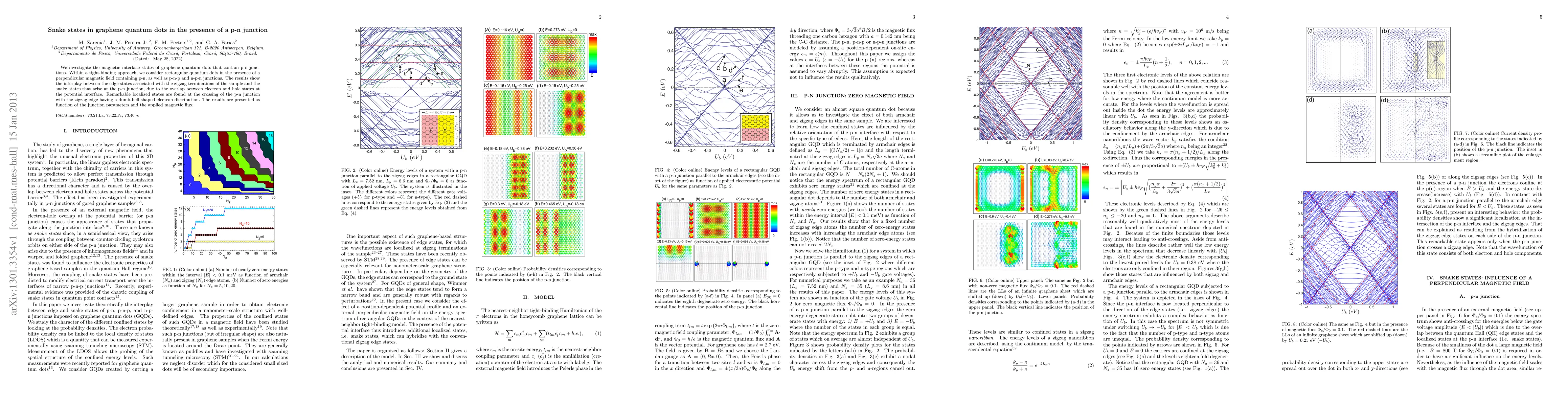 This paper explores the magnetic interface states in graphene quantum dots with p-n junctions using a tight-binding approach. It highlights the emergence of snake states at the junction interface due to electron-hole overlap, alongside localized zigzag edge states, with notable dumbbell-shaped electron distributions at junction-edge intersections.