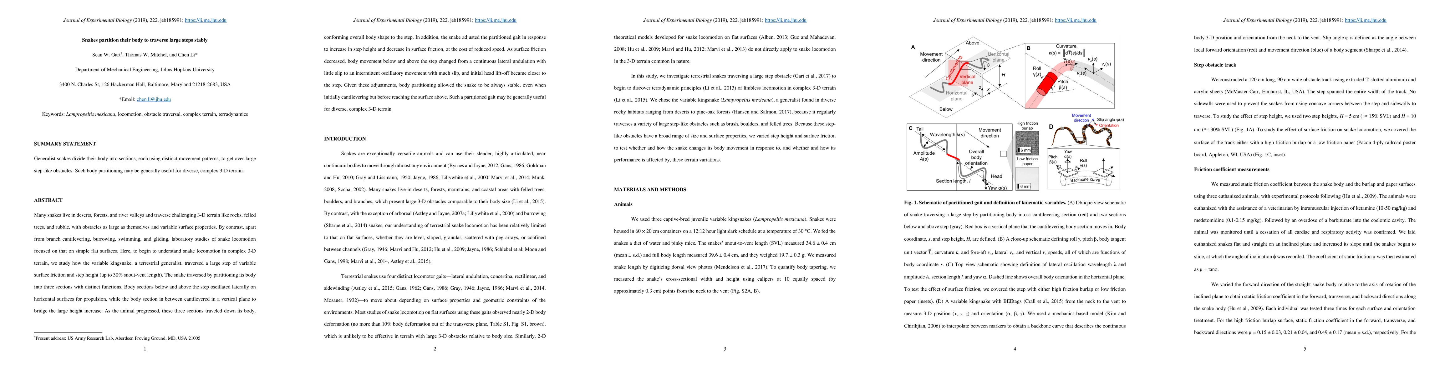 This study examines how snakes, specifically kingsnakes, navigate large, variable obstacles in complex 3-D terrains. The snakes partition their bodies into three sections, each with distinct functions, to maintain stability. This partitioned gait adjusts to varying step heights and surface frictions, ensuring stability even when initially cantilevered over the step. This finding suggests a generally applicable strategy for diverse, challenging terrains.