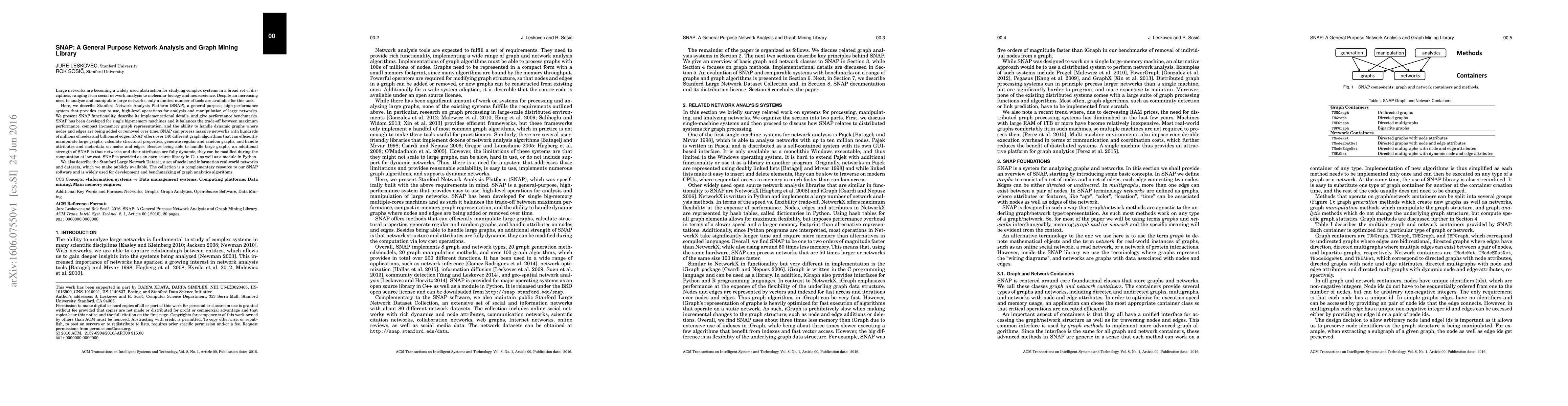 Large networks are becoming a widely used abstraction for studying complex systems in a broad set of disciplines, ranging from social network analysis to molecular biology and neuroscience. Despite an increasing need to analyze and manipulate large networks, only a limited number of tools are available for this task. Here, we describe Stanford Network Analysis Platform (SNAP), a general-purpose, high-performance system that provides easy to use, high-level operations for analysis and manipulation of large networks. We present SNAP functionality, describe its implementational details, and give performance benchmarks. SNAP has been developed for single big-memory machines and it balances the trade-off between maximum performance, compact in-memory graph representation, and the ability to handle dynamic graphs where nodes and edges are being added or removed over time. SNAP can process massive networks with hundreds of millions of nodes and billions of edges. SNAP offers over 140 different graph algorithms that can efficiently manipulate large graphs, calculate structural properties, generate regular and random graphs, and handle attributes and meta-data on nodes and edges. Besides being able to handle large graphs, an additional strength of SNAP is that networks and their attributes are fully dynamic, they can be modified during the computation at low cost. SNAP is provided as an open source library in C++ as well as a module in Python. We also describe the Stanford Large Network Dataset, a set of social and information real-world networks and datasets, which we make publicly available. The collection is a complementary resource to our SNAP software and is widely used for development and benchmarking of graph analytics algorithms.