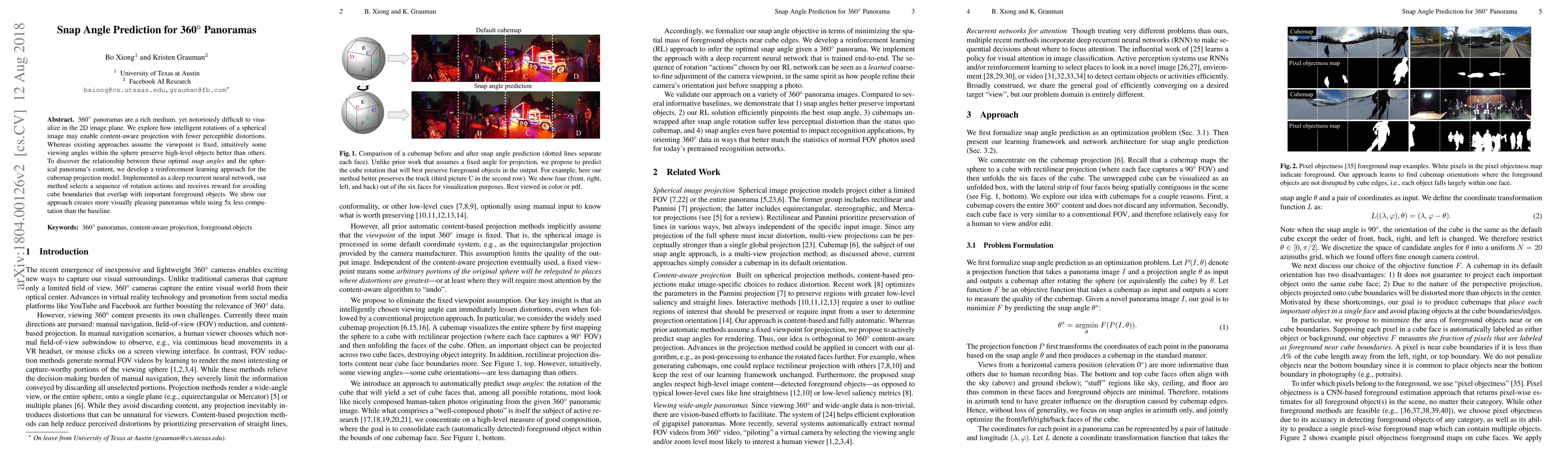 This paper proposes a reinforcement learning method to predict optimal snap angles for 360° panoramas, aiming to minimize distortions while preserving important objects. The approach uses a deep recurrent neural network to select rotation actions, achieving more visually pleasing results with significantly lower computational cost compared to baseline methods.