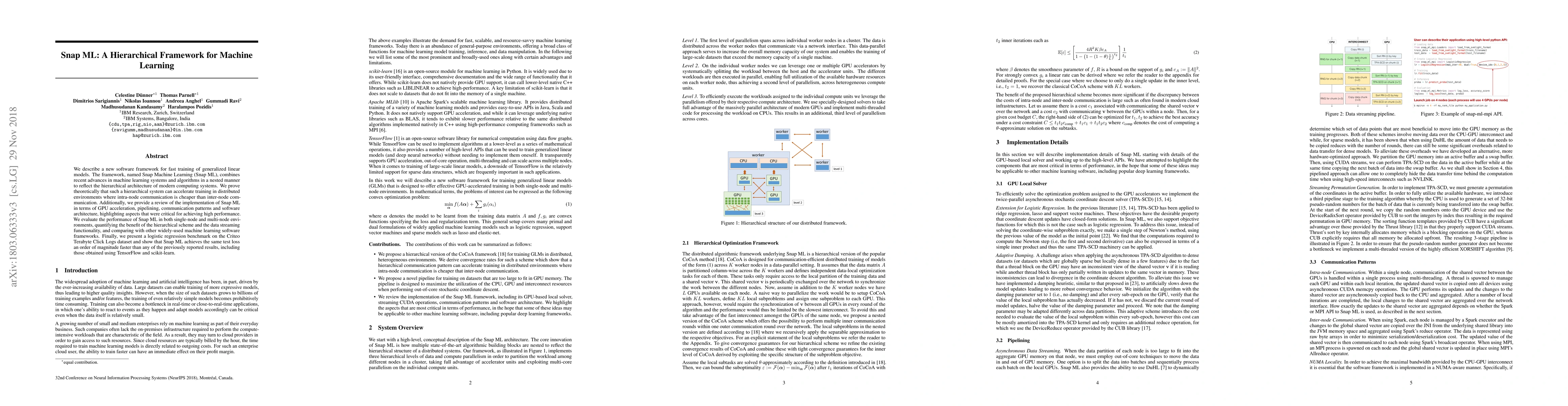 Snap ML is a new hierarchical framework for fast training of generalized linear models, leveraging GPU acceleration and pipelining to enhance performance. It demonstrates significant speedups in distributed environments and outperforms other frameworks, achieving an order of magnitude faster training on large datasets.