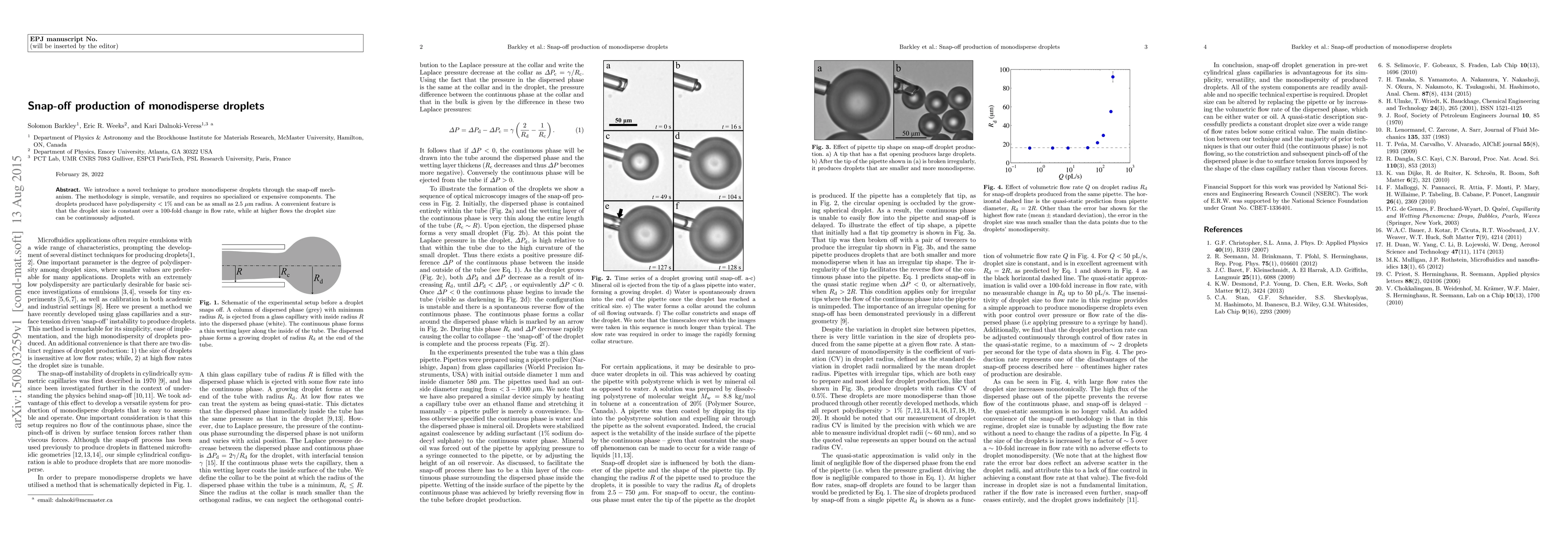 This paper presents a straightforward technique for generating monodisperse droplets via the snap-off mechanism, achieving polydispersity below 1% and sizes as small as 2.5 µm. The method maintains constant droplet size over a wide range of flow rates and allows for continuous size adjustment at higher flows.
