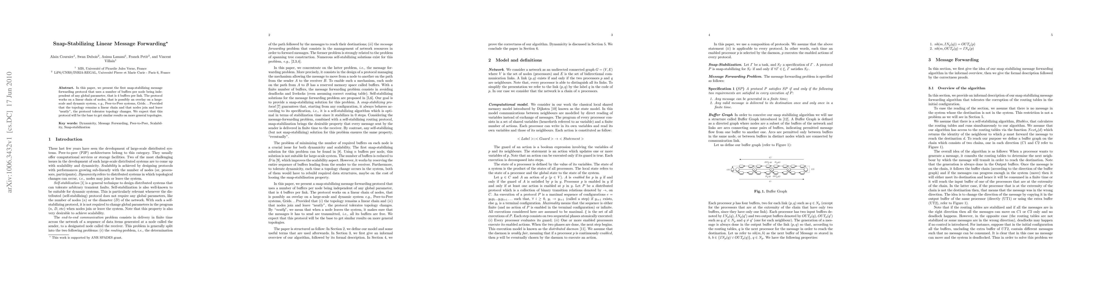 In this paper, we present the first snap-stabilizing message forwarding protocol that uses a number of buffers per node being inde- pendent of any global parameter, that is 4 buffers per link. The protocol works on a linear chain of nodes, that is possibly an overlay on a large- scale and dynamic system, e.g., Peer-to-Peer systems, Grids. . . Provided that the topology remains a linear chain and that nodes join and leave "neatly", the protocol tolerates topology changes. We expect that this protocol will be the base to get similar results on more general topologies.