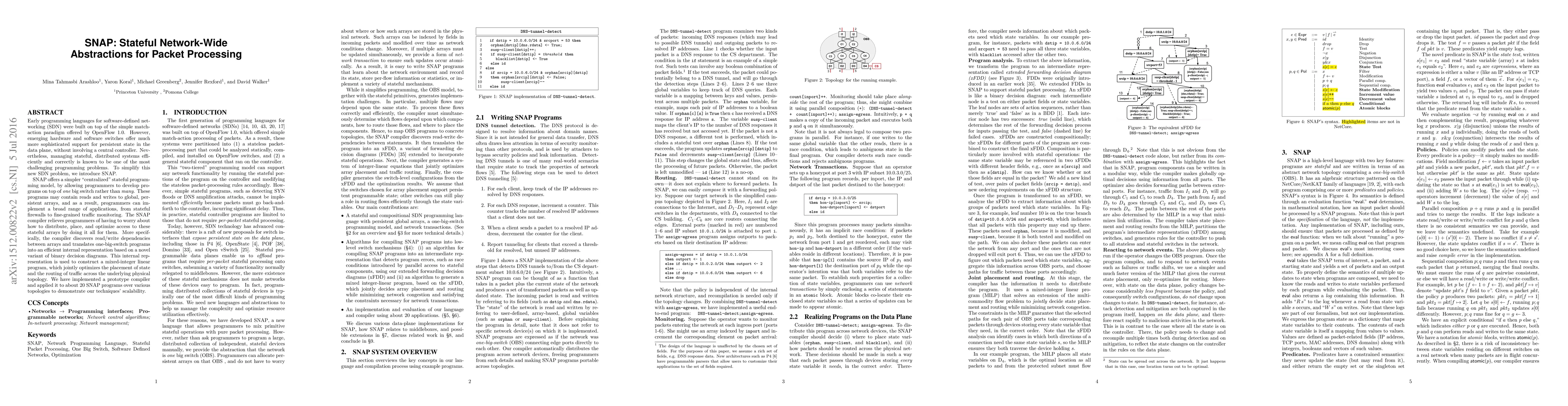 SNAP introduces a stateful programming model for software-defined networking, simplifying the management of stateful, distributed systems by abstracting away the complexities of state distribution and optimization. The SNAP compiler automatically translates high-level programs into an efficient internal representation, optimizing state placement and traffic routing across the network.