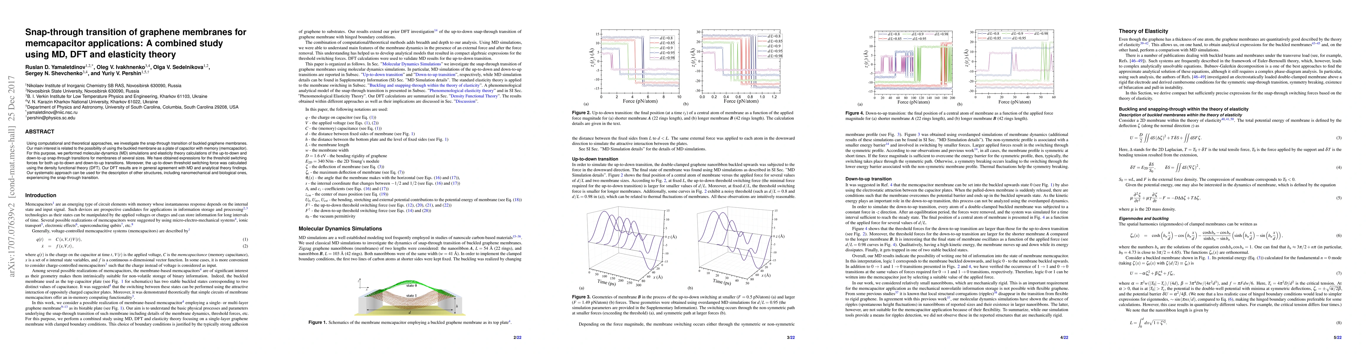 This paper investigates the snap-through transition in buckled graphene membranes using MD simulations, DFT calculations, and elasticity theory, aiming to utilize the buckled state for memcapacitor applications. The study provides expressions for threshold switching forces and validates DFT results with MD and analytical theory, suggesting applicability to other snap-through structures.