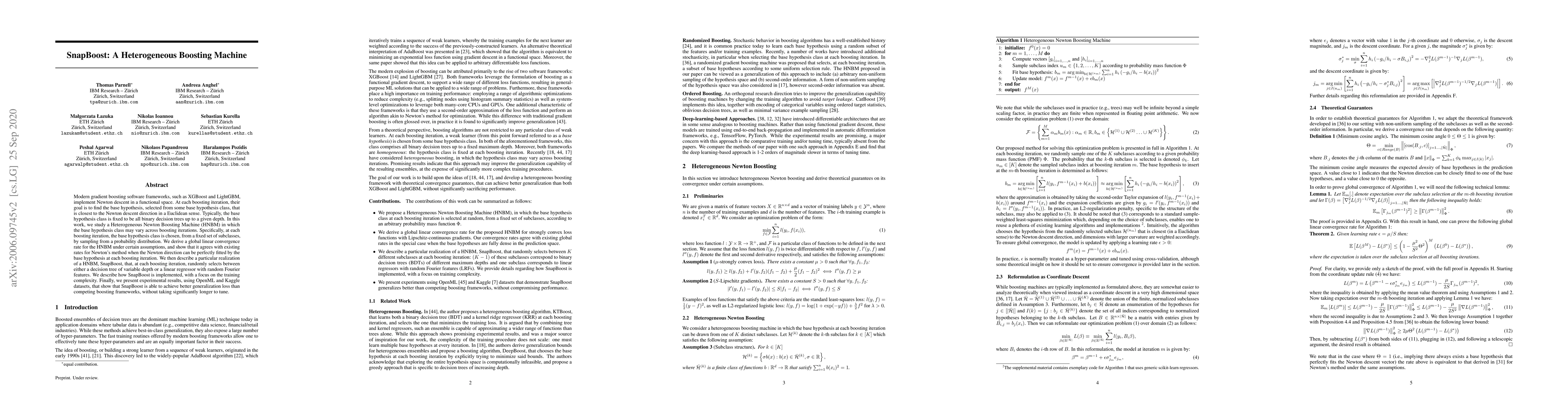 Modern gradient boosting software frameworks, such as XGBoost and LightGBM, implement Newton descent in a functional space. At each boosting iteration, their goal is to find the base hypothesis, selected from some base hypothesis class, that is closest to the Newton descent direction in a Euclidean sense. Typically, the base hypothesis class is fixed to be all binary decision trees up to a given depth. In this work, we study a Heterogeneous Newton Boosting Machine (HNBM) in which the base hypothesis class may vary across boosting iterations. Specifically, at each boosting iteration, the base hypothesis class is chosen, from a fixed set of subclasses, by sampling from a probability distribution. We derive a global linear convergence rate for the HNBM under certain assumptions, and show that it agrees with existing rates for Newton's method when the Newton direction can be perfectly fitted by the base hypothesis at each boosting iteration. We then describe a particular realization of a HNBM, SnapBoost, that, at each boosting iteration, randomly selects between either a decision tree of variable depth or a linear regressor with random Fourier features. We describe how SnapBoost is implemented, with a focus on the training complexity. Finally, we present experimental results, using OpenML and Kaggle datasets, that show that SnapBoost is able to achieve better generalization loss than competing boosting frameworks, without taking significantly longer to tune.