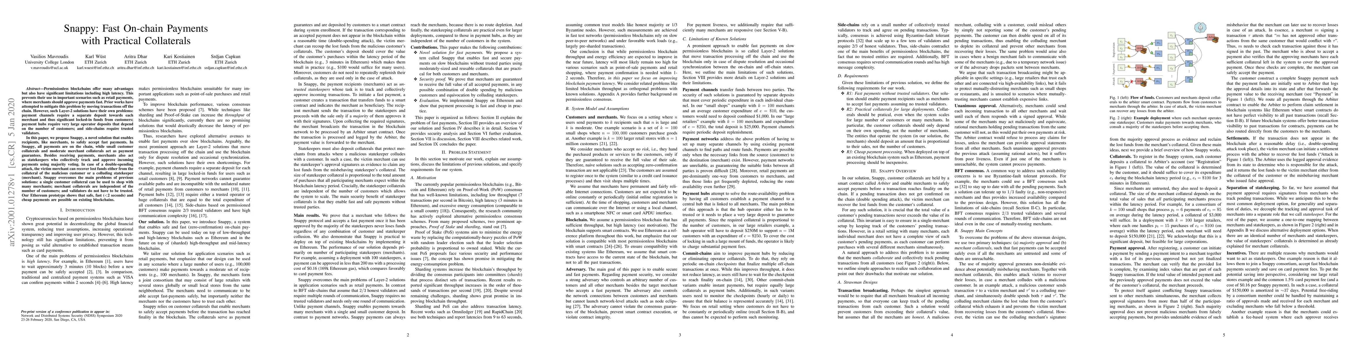 Snappy is a novel on-chain payment solution that uses small customer collaterals and moderate merchant collaterals to guarantee fast payments, addressing the high latency issue in permissionless blockchains. Unlike previous Layer-2 solutions, Snappy allows a single customer collateral to be used across multiple merchants, eliminates the need for large merchant deposits, and does not require trusted validators.