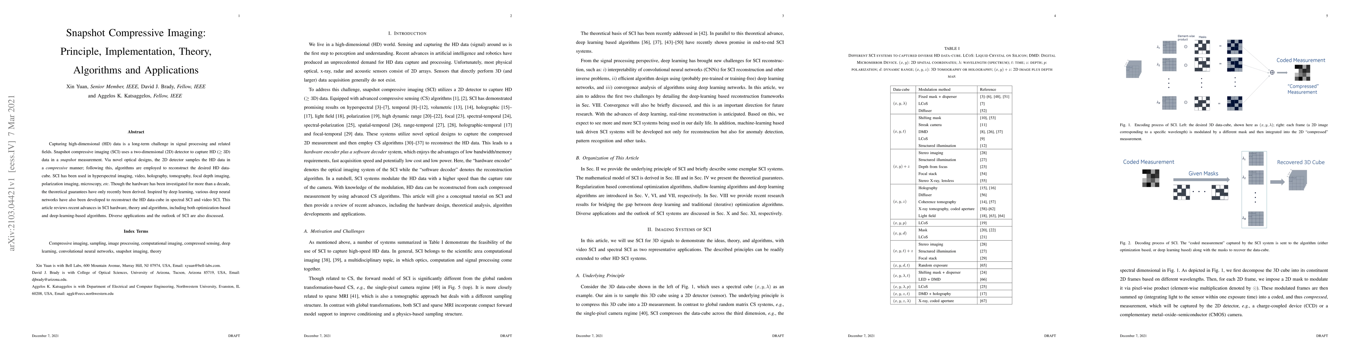 Snapshot compressive imaging (SCI) captures high-dimensional data via a 2D detector in a single measurement, employing novel optical designs and algorithms for reconstruction. Recent advances in SCI include theoretical foundations, optimization-based and deep-learning-based algorithms, and diverse applications in imaging fields.