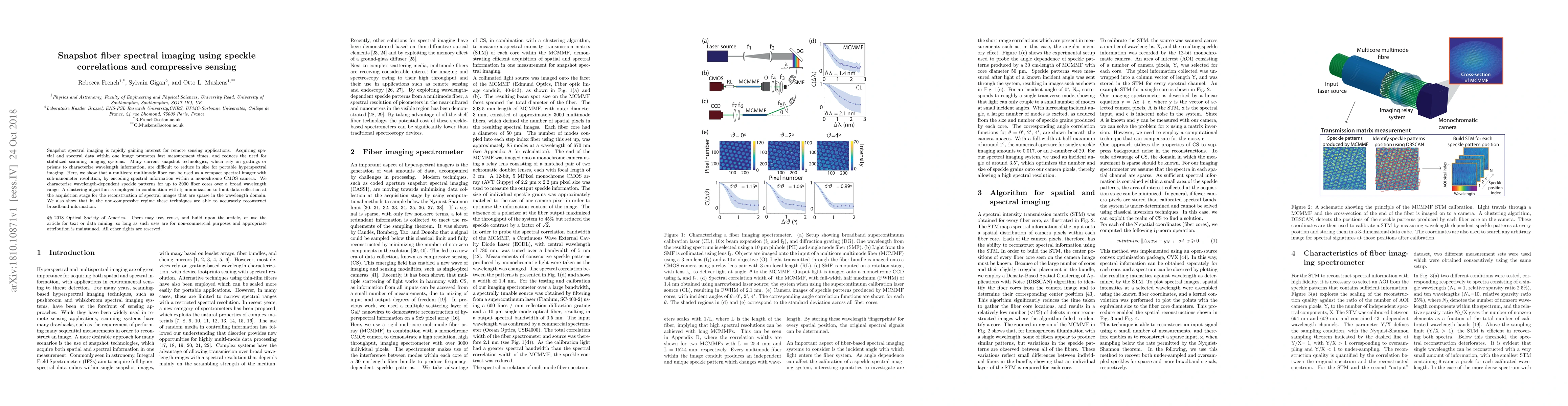 Snapshot spectral imaging is rapidly gaining interest for remote sensing applications. Acquiring spatial and spectral data within one image promotes fast measurement times, and reduces the need for stabilized scanning imaging systems. Many current snapshot technologies, which rely on gratings or prisms to characterize wavelength information, are difficult to reduce in size for portable hyperspectral imaging. Here, we show that a multicore multimode fiber can be used as a compact spectral imager with sub-nanometer resolution, by encoding spectral information within a monochrome CMOS camera. We characterize wavelength-dependent speckle patterns for up to 3000 fiber cores over a broad wavelength range. A clustering algorithm is employed in combination with l$_{1}$-minimization to limit data collection at the acquisition stage for the reconstruction of spectral images that are sparse in the wavelength domain. We also show that in the non-compressive regime these techniques are able to accurately reconstruct broadband information.