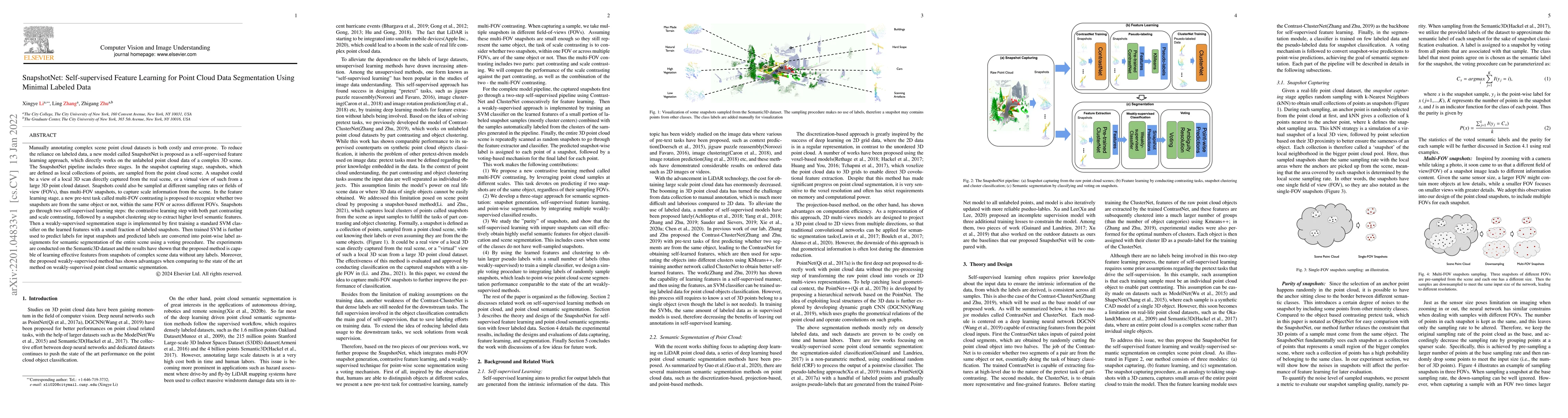 SnapshotNet uses self-supervised feature learning to segment complex 3D scenes with minimal labeled data, achieving better results than traditional methods on the Semantic3D dataset.