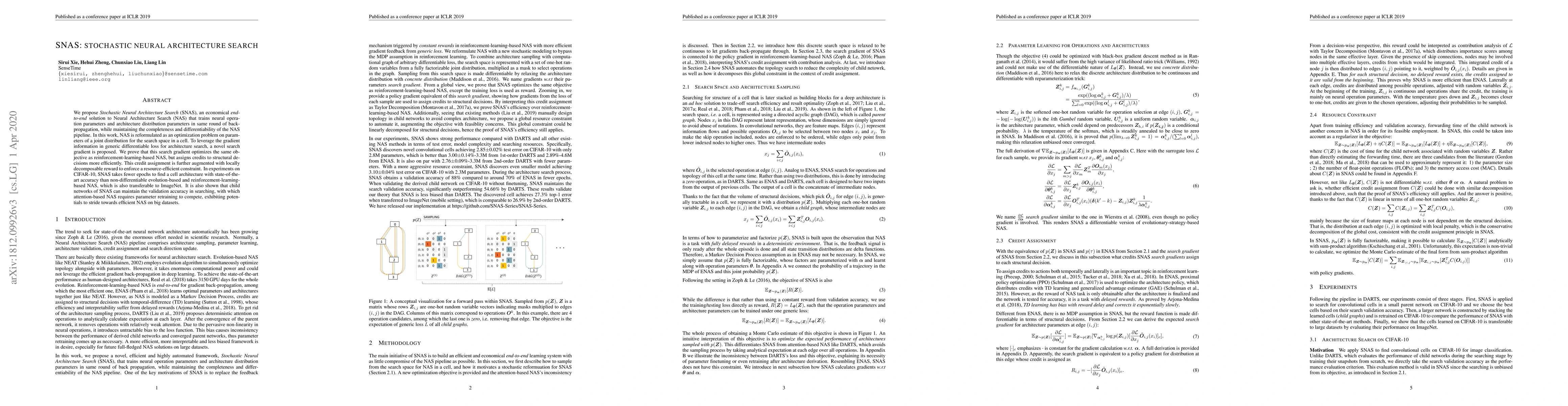 The paper proposes Stochastic Neural Architecture Search (SNAS), an efficient end-to-end method for neural architecture search that integrates neural operation and architecture distribution parameters during back-propagation. It demonstrates superior performance on CIFAR-10 and transferability to ImageNet, achieving state-of-the-art accuracy with fewer epochs compared to other NAS methods.