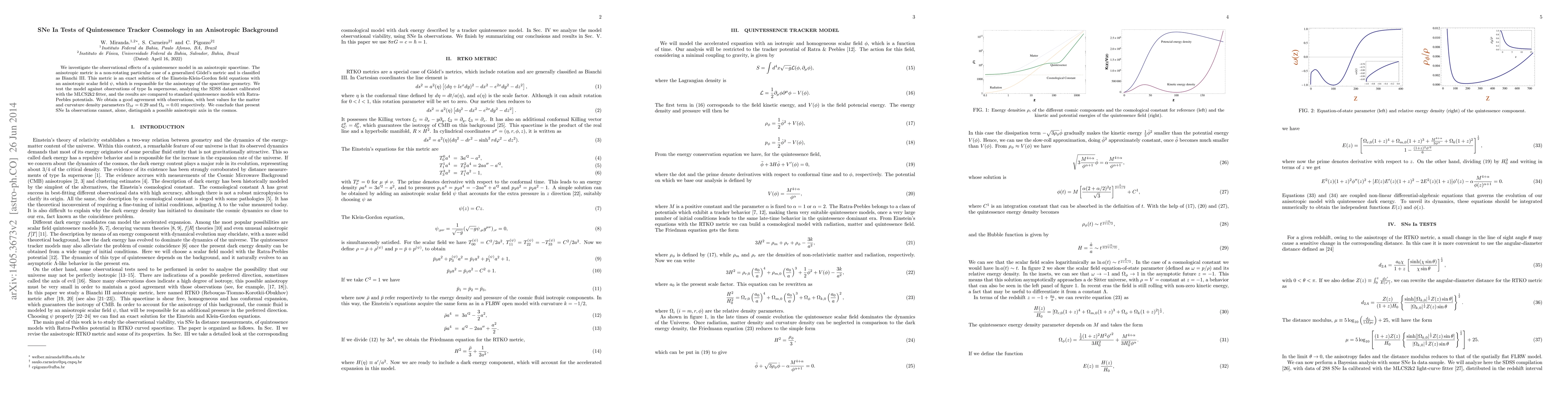 We investigate the observational effects of a quintessence model in an anisotropic spacetime. The anisotropic metric is a non-rotating particular case of a generalized Godel's metric and is classified as Bianchi III. This metric is an exact solution of the Einstein-Klein-Gordon field equations with an anisotropic scalar field, which is responsible for the anisotropy of the spacetime geometry. We test the model against observations of type Ia supernovae, analyzing the SDSS dataset calibrated with the MLCS2k2 fitter, and the results are compared to standard quintessence models with Ratra-Peebles potentials. We obtain a good agreement with observations, with best values for the matter and curvature density parameters $\Omega_M = 0.29$ and $\Omega_k= 0.01$ respectively. We conclude that present SNe Ia observations cannot, alone, distinguish a possible anisotropic axis in the cosmos.