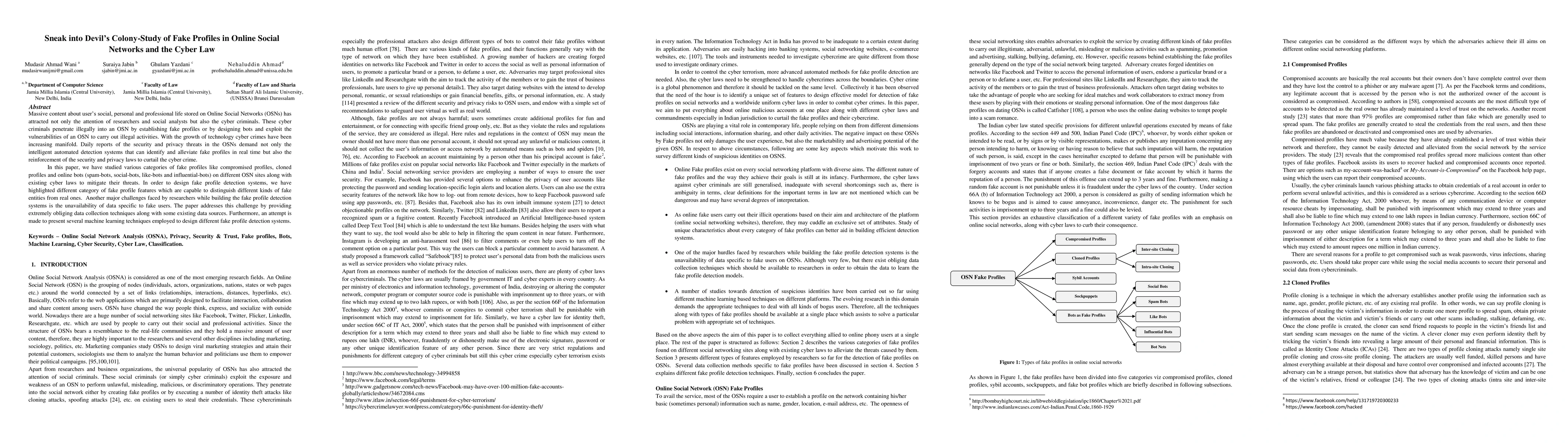 This paper investigates various types of fake profiles on Online Social Networks (OSNs) and their exploitation by cybercriminals, alongside existing cyber laws. It highlights features to distinguish fake entities and discusses data collection techniques and machine learning methods for detecting fake profiles.