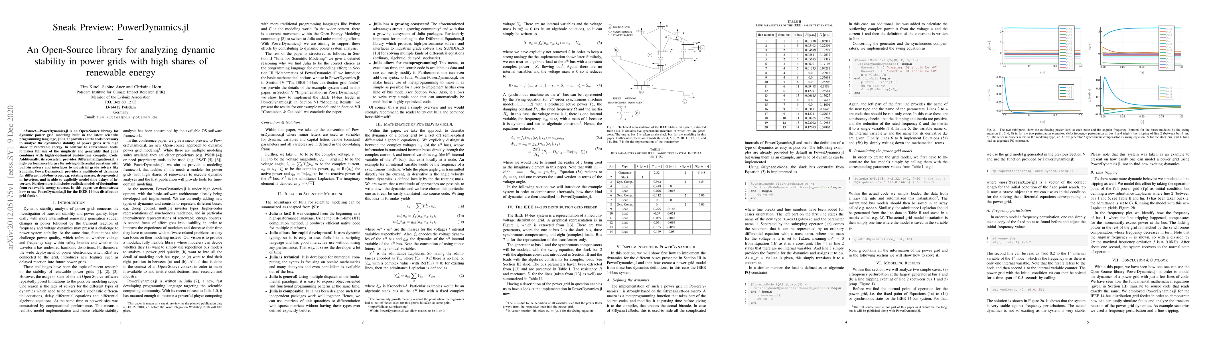 PowerDynamics.jl is an open-source library in Julia for dynamic power grid modeling, focusing on stability analysis in grids with high renewable energy shares. It leverages Julia's efficiency and DifferentialEquations.jl for solving differential equations, offering detailed models for various grid components and renewable fluctuations.