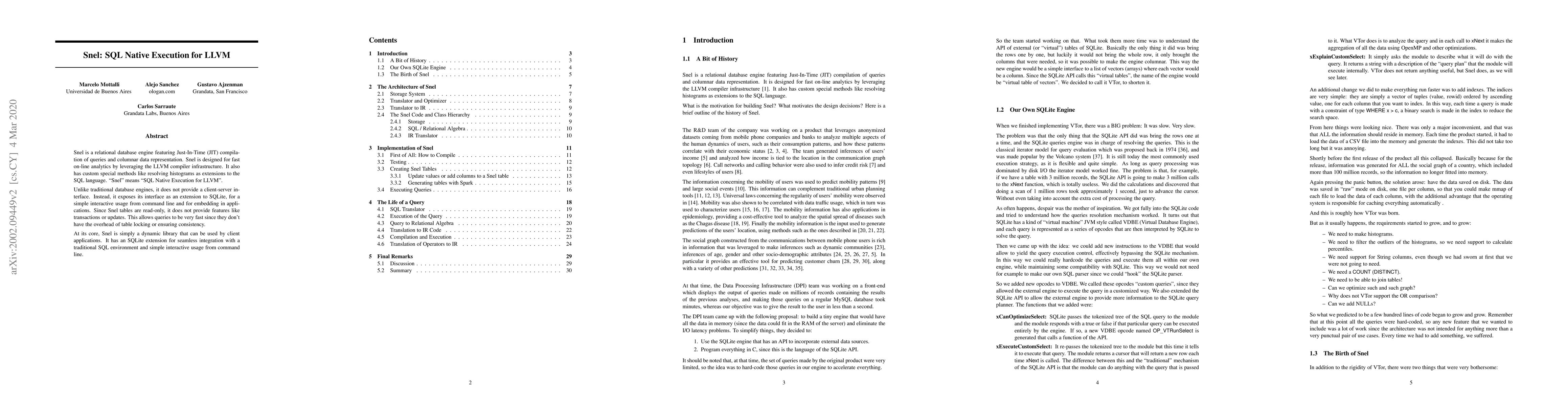 Snel is a relational database engine featuring Just-In-Time (JIT) compilation of queries and columnar data representation. Snel is designed for fast on-line analytics by leveraging the LLVM compiler infrastructure. It also has custom special methods like resolving histograms as extensions to the SQL language. "Snel" means "SQL Native Execution for LLVM". Unlike traditional database engines, it does not provide a client-server interface. Instead, it exposes its interface as an extension to SQLite, for a simple interactive usage from command line and for embedding in applications. Since Snel tables are read-only, it does not provide features like transactions or updates. This allows queries to be very fast since they don't have the overhead of table locking or ensuring consistency. At its core, Snel is simply a dynamic library that can be used by client applications. It has an SQLite extension for seamless integration with a traditional SQL environment and simple interactive usage from command line.