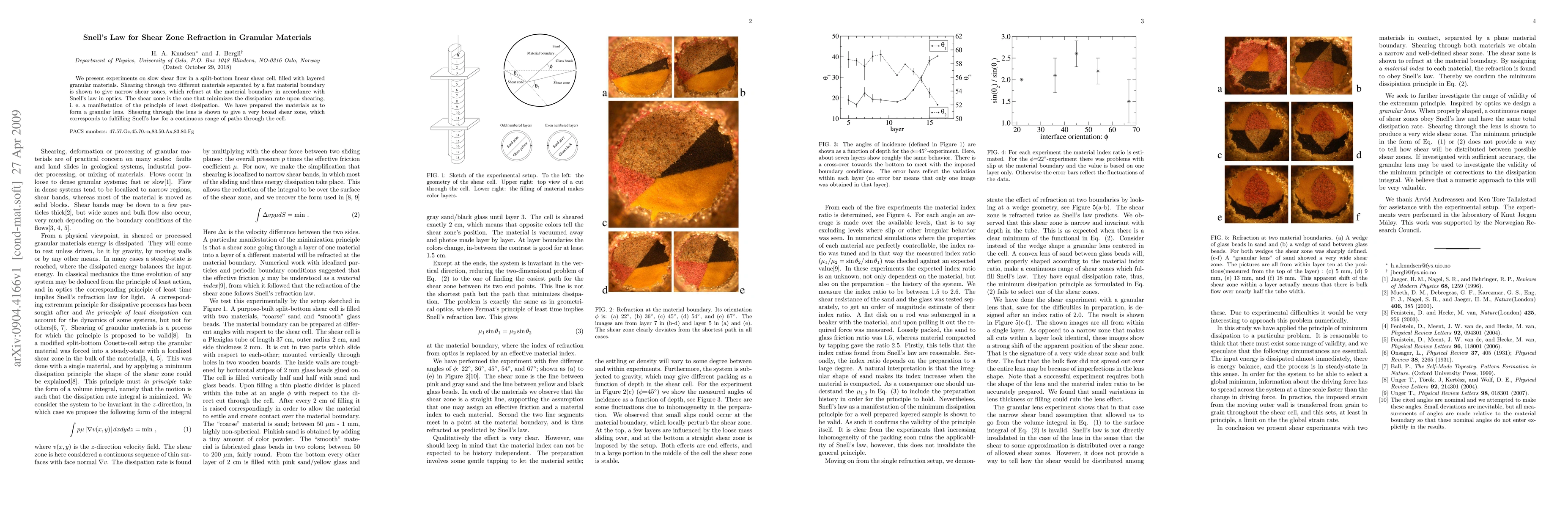 This study demonstrates that shear zones in granular materials refract at material boundaries according to Snell's law, akin to light refraction in optics, and form a granular lens that generates broad shear zones fulfilling Snell's law over a continuous range of paths. The principle of least dissipation governs the formation of these shear zones.