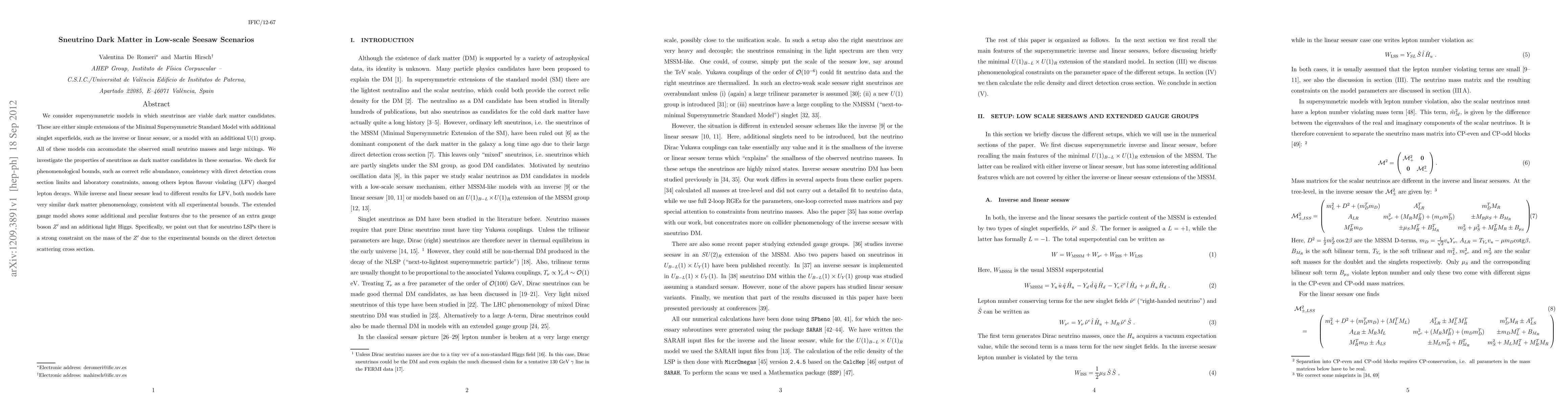 This paper explores supersymmetric models where sneutrinos serve as dark matter candidates, investigating their viability under various low-scale seesaw scenarios. The study finds that sneutrinos in inverse and linear seesaw models, as well as in an extended gauge model, meet experimental constraints and can accommodate observed neutrino masses and mixings.