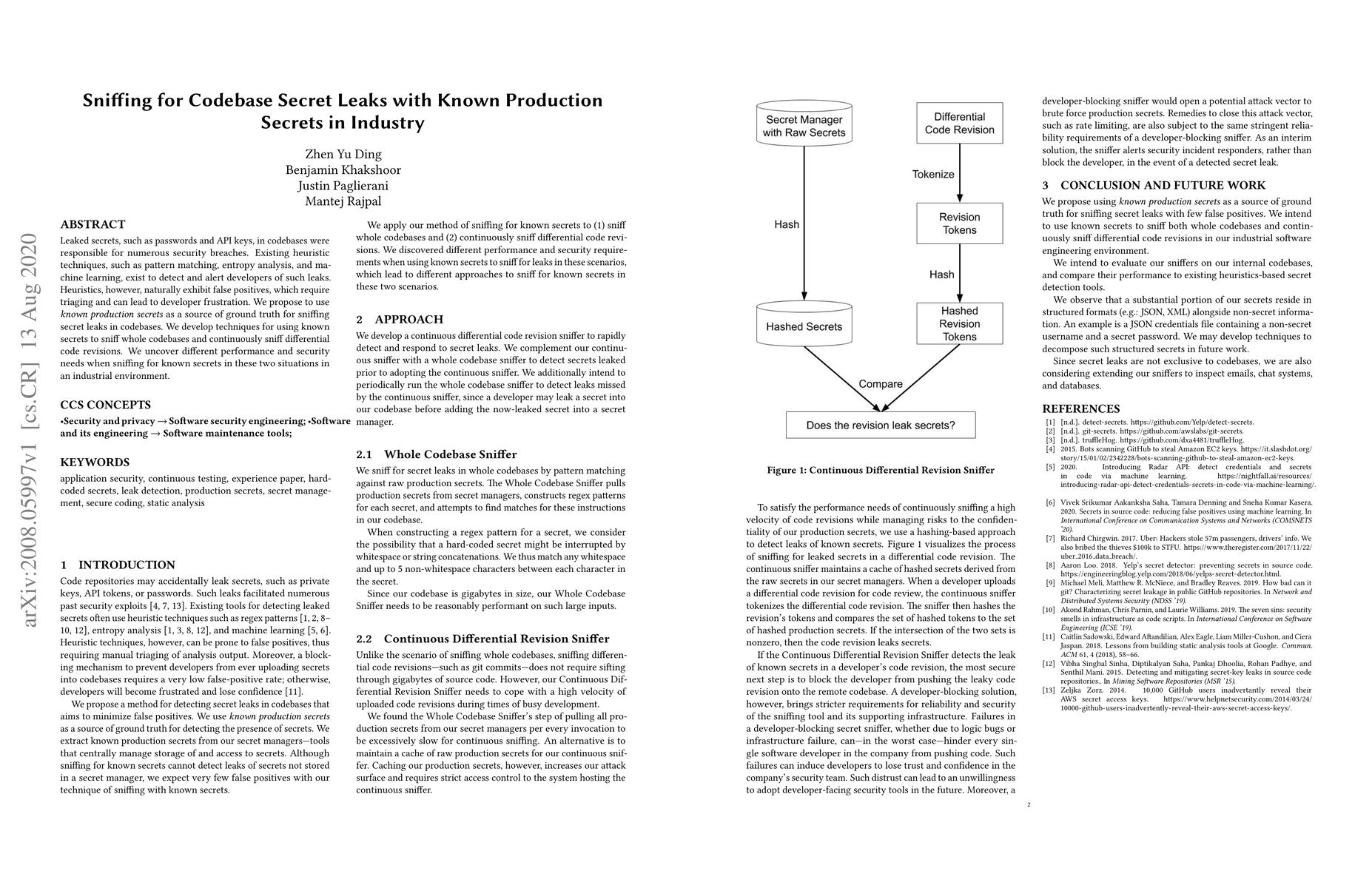 This paper proposes using known production secrets as ground truth to detect secret leaks in codebases, aiming to reduce false positives. It develops techniques for continuous sniffing of whole codebases and differential code revisions, highlighting performance and security differences in these two scenarios in an industrial setting.