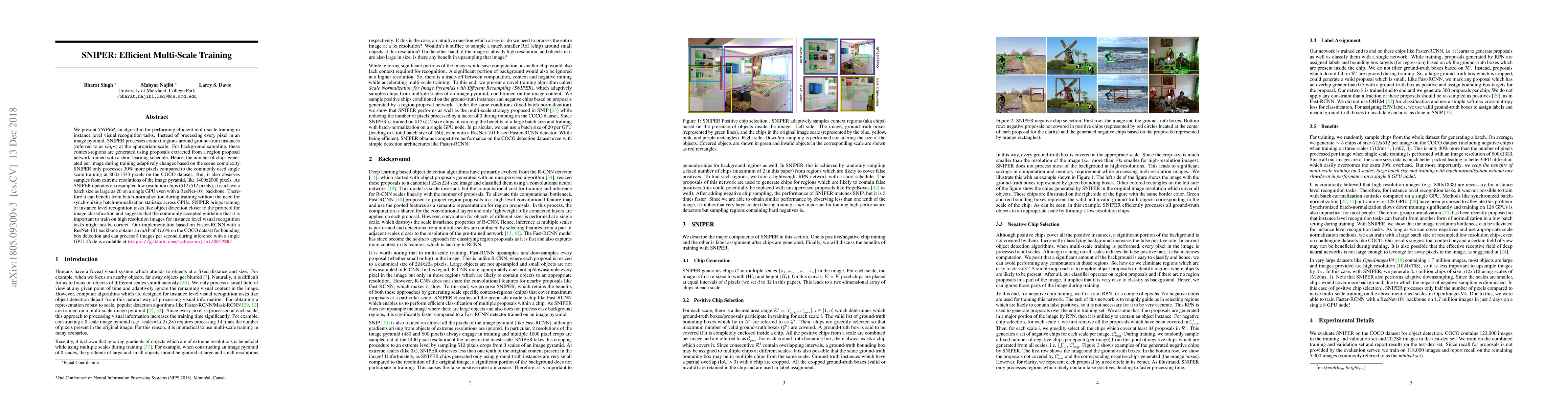 SNIPER is an efficient multi-scale training algorithm for instance-level visual recognition tasks that processes context regions around ground-truth instances, achieving similar performance to single-scale training while using only 30% more pixels. It achieves this by adaptively generating chips based on scene complexity and utilizing large batch sizes, leading to competitive mAP on COCO and fast inference speeds.