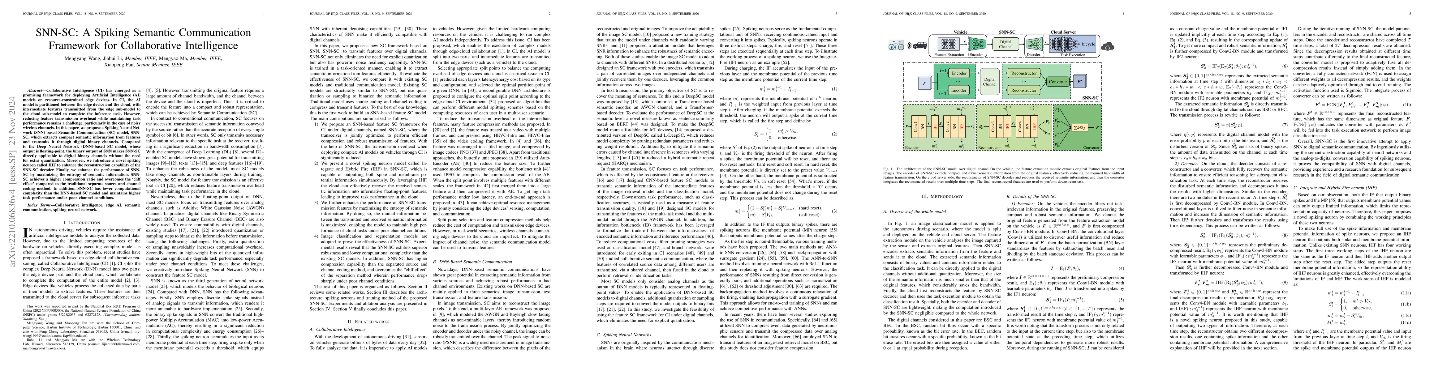 This research introduces a novel Spiking Semantic Communication (SNN-SC) framework designed to enhance feature transmission in Collaborative Intelligence systems. By leveraging Spiking Neural Networks, SNN-SC efficiently extracts and transmits only the most relevant information for downstream tasks, optimizing performance on digital channels. The results demonstrate improved robustness compared to traditional methods, particularly under bandwidth constraints.