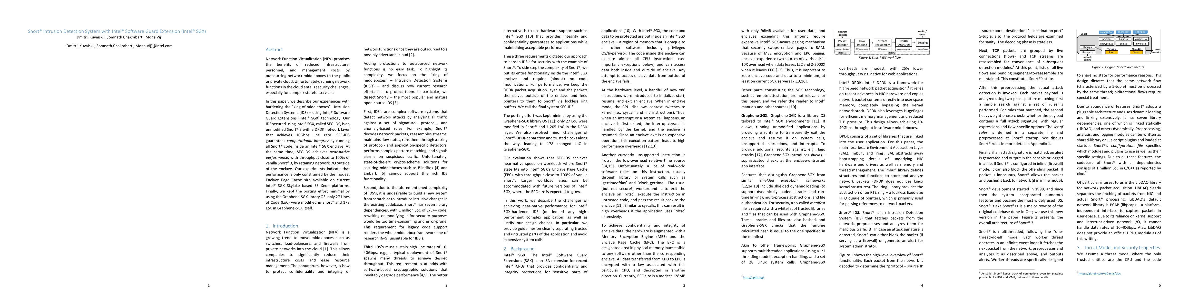 This paper presents SEC-IDS, an enhanced Intrusion Detection System using Intel Software Guard Extensions (Intel SGX) to secure Snort 3, achieving 10Gbps throughput while maintaining near-native performance. The minimal porting effort involved only 27 lines of code modification in Snort and 178 in Graphene-SGX.