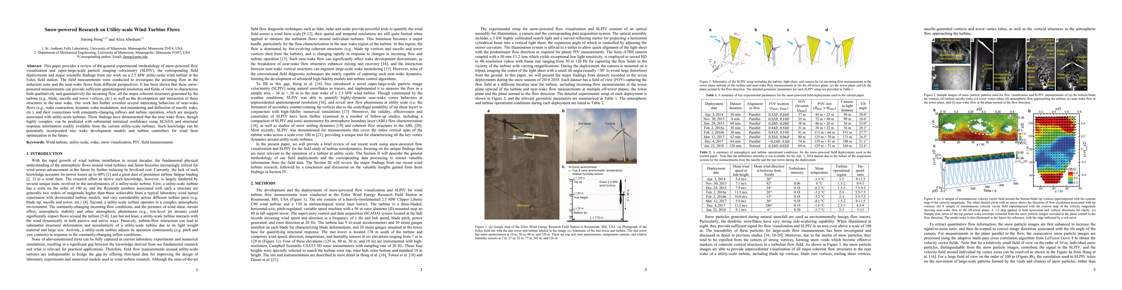 This paper provides a review of the general experimental methodology of snow-powered flow visualization and super-large-scale particle imaging velocimetry (SLPIV), the corresponding field deployments and major scientific findings from our work on a 2.5 MW utility-scale wind turbine at the Eolos field station. The field measurements were conducted to investigate the incoming flow in the induction zone and the near-wake flows from different perspectives. It has been shown that these snow-powered measurements can provide sufficient spatiotemporal resolution and fields of view to characterize both qualitatively and quantitatively the incoming flow, all the major coherent structures generated by the turbine (e.g., blade, nacelle and tower vortices, etc.) as well as the development and interaction of these structures in the near wake. Our work has further revealed several interesting behaviors of near-wake flows (e.g., wake contraction, dynamic wake modulation, and meandering and deflection of nacelle wake, etc.), and their connections with constantly-changing inflows and turbine operation, which are uniquely associated with utility-scale turbines. These findings have demonstrated that the near wake flows, though highly complex, can be predicted with substantial statistical confidence using SCADA and structural response information readily available from the current utility-scale turbines. Such knowledge can be potentially incorporated into wake development models and turbine controllers for wind farm optimization in the future.