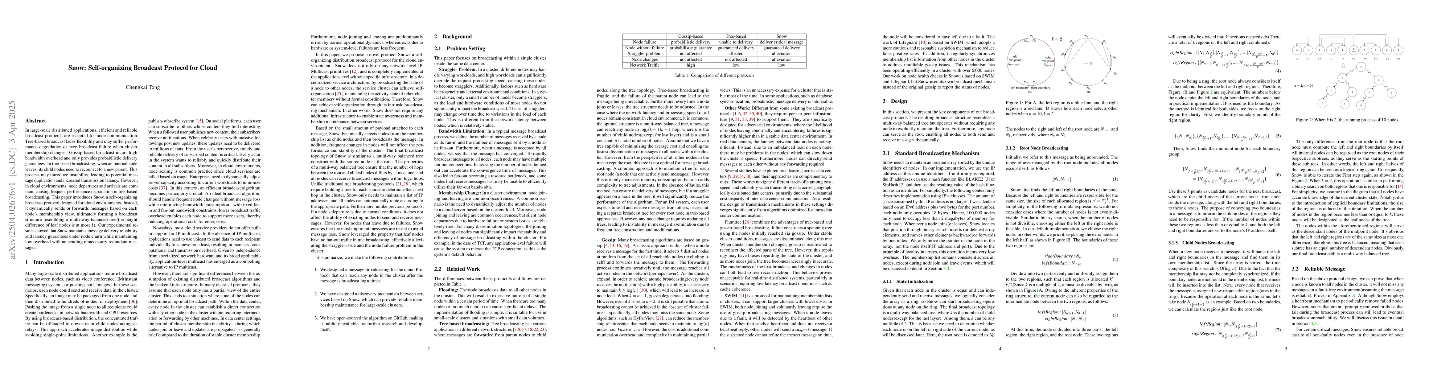 The paper introduces Snow, a self-organizing broadcast protocol for cloud environments, dynamically sending or forwarding messages based on each node's membership view to form a multi-way balanced tree structure.