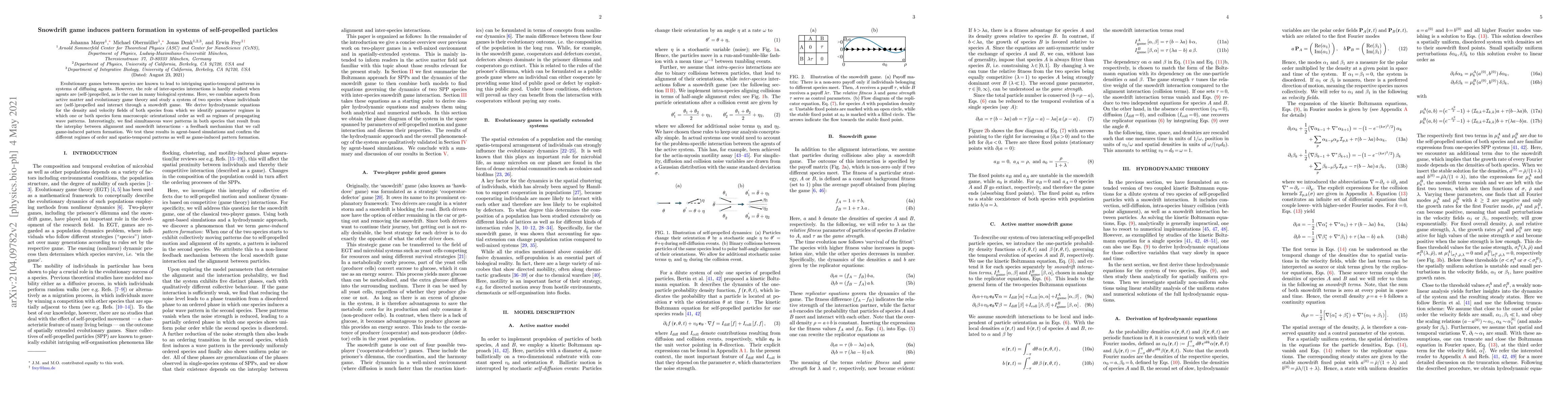 This paper explores how a snowdrift game between self-propelled species leads to complex spatio-temporal patterns, identifying regimes where species exhibit macroscopic orientational order and wave patterns through a combination of evolutionary game theory and active-matter dynamics. Simulations confirm the emergence of game-induced pattern formation through the interplay of alignment and snowdrift interactions.